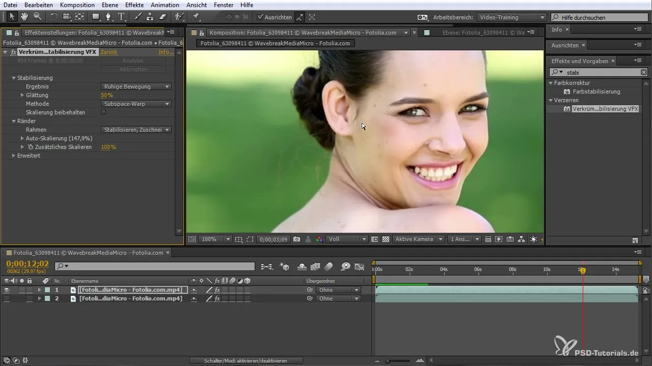 Nachdem du die gewünschten Tracking-Punkte gesetzt hast, kannst du die Stabilisierung erneut durchführen. Überprüfe, ob das Ergebnis deinen Anforderungen entspricht und passe gegebenenfalls die Parameter weiter an. Achte darauf, ob das Gesicht der Dame im Bild stabilisiert bleibt, während der Rest des Hintergrunds noch Bewegung zeigt.