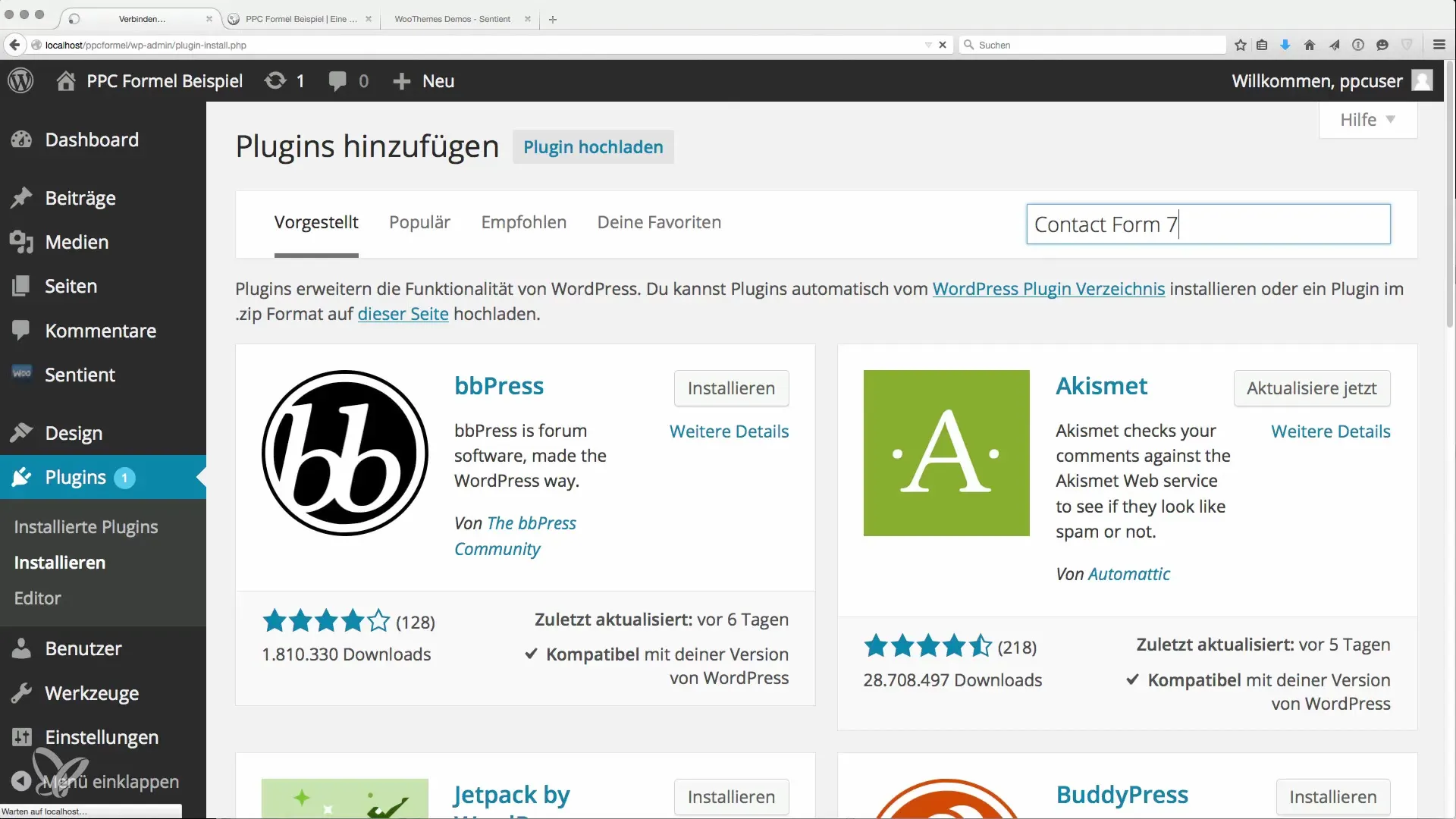 Eines der ersten Plugins, das ich immer empfehle, ist "Contact Form 7". Dies ist ein fantastisches Plugin für Formulare auf deiner Kontaktseite, das sich leicht anpassen lässt. Du kannst damit CSS anpassen und hast die Flexibilität, die du benötigst. Installiere es und aktiviere es zuerst.