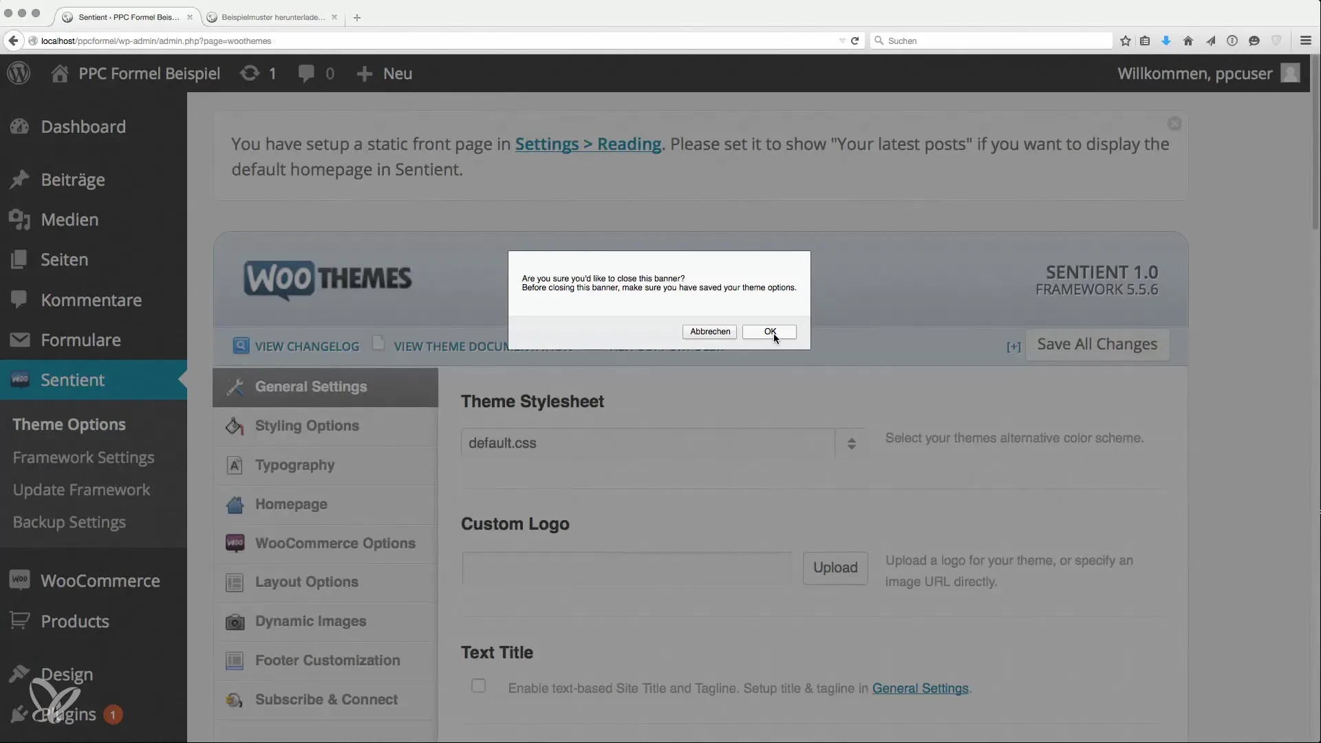 Sobald du in den Theme-Optionen bist, kannst du die allgemeinen Einstellungen vornehmen. Deaktiviere zunächst alle überflüssigen Hinweise oder Werbung, um den Konfigurationsprozess klarer zu gestalten. Hier findest du das Backend mit den Konfigurationseinstellungen.