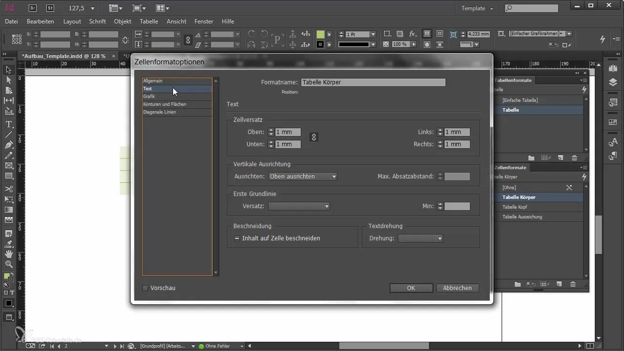 Blicke nun genauer auf das Zellenformat „Tabelle Körper“. In diesen Einstellungen kannst du festlegen, dass der Text um 1 mm vom Rand des Zellenabschlusses versetzt wird. Da die Zellenformate selbst keine Konturen oder Flächenfarben definieren, musst du diese im Tabellenformat festlegen.