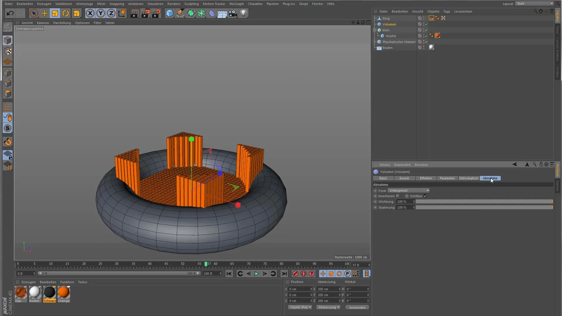 Wie definiere ich das Volumen für den Effektor?Du kannst ein Grundobjekt, zum Beispiel einen Ring, verwenden und es im Effektor als Volumenobjekt festlegen.