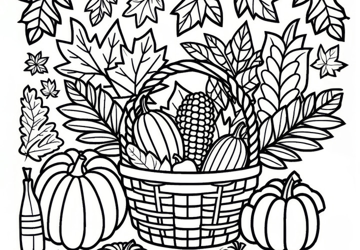 Harvest basket with fruit, vegetables, nuts, and grains: Coloring page for Thanksgiving (Free)