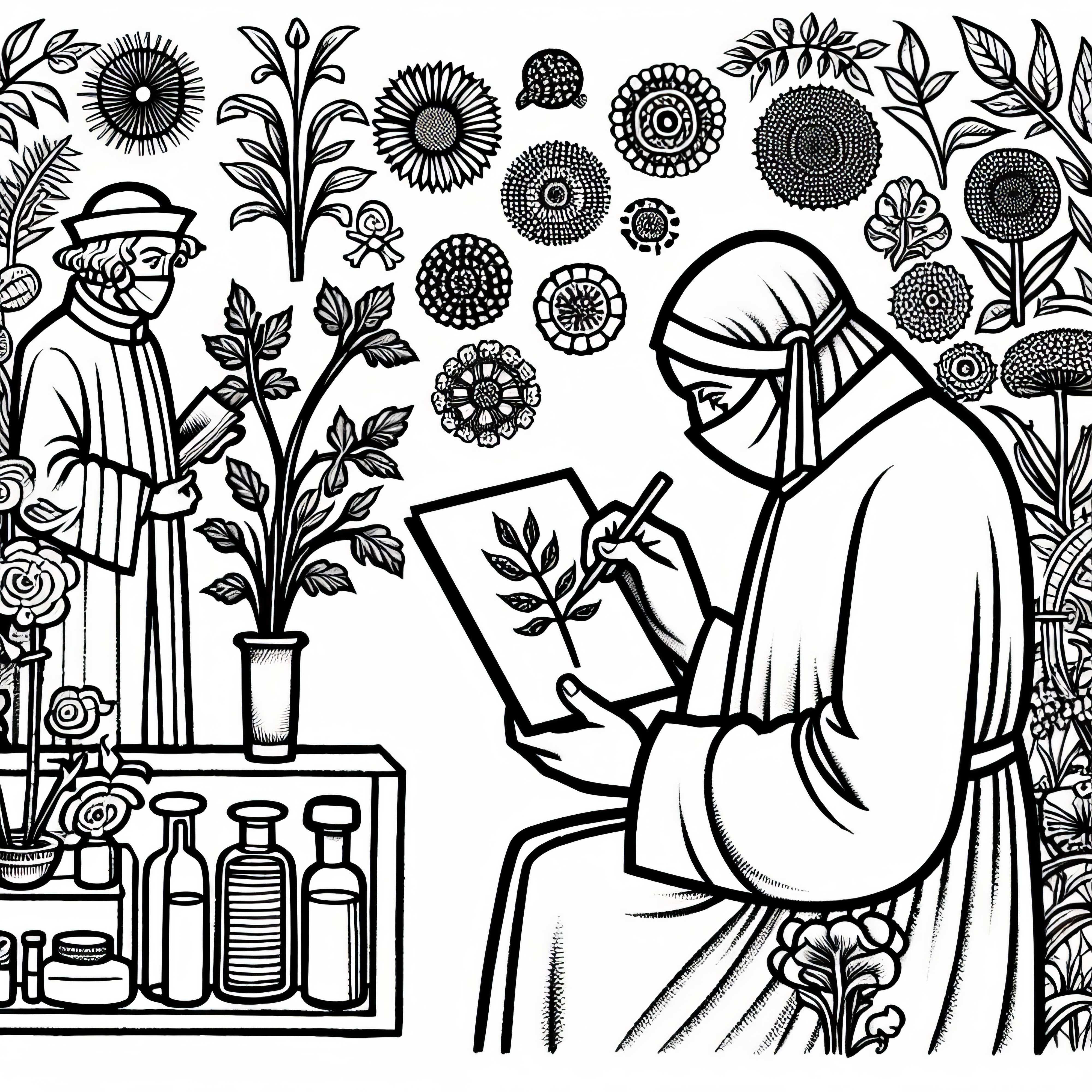 На нашата оцветяваща картина виждаш жена, която рисува лечебно растение. Сцената се развива по време на чумата, известна също като Черната смърт. Тази висококачествена оцветяваща картина във JPG формат е отлична за отпечатване и оцветяване. Тя е безплатна и можеш лесно да я изтеглиш. Освен това имаш възможността да я оцветиш онлайн. Изтегли оцветяващата картина сега и внеси цвят в тази историческа илюстрация!