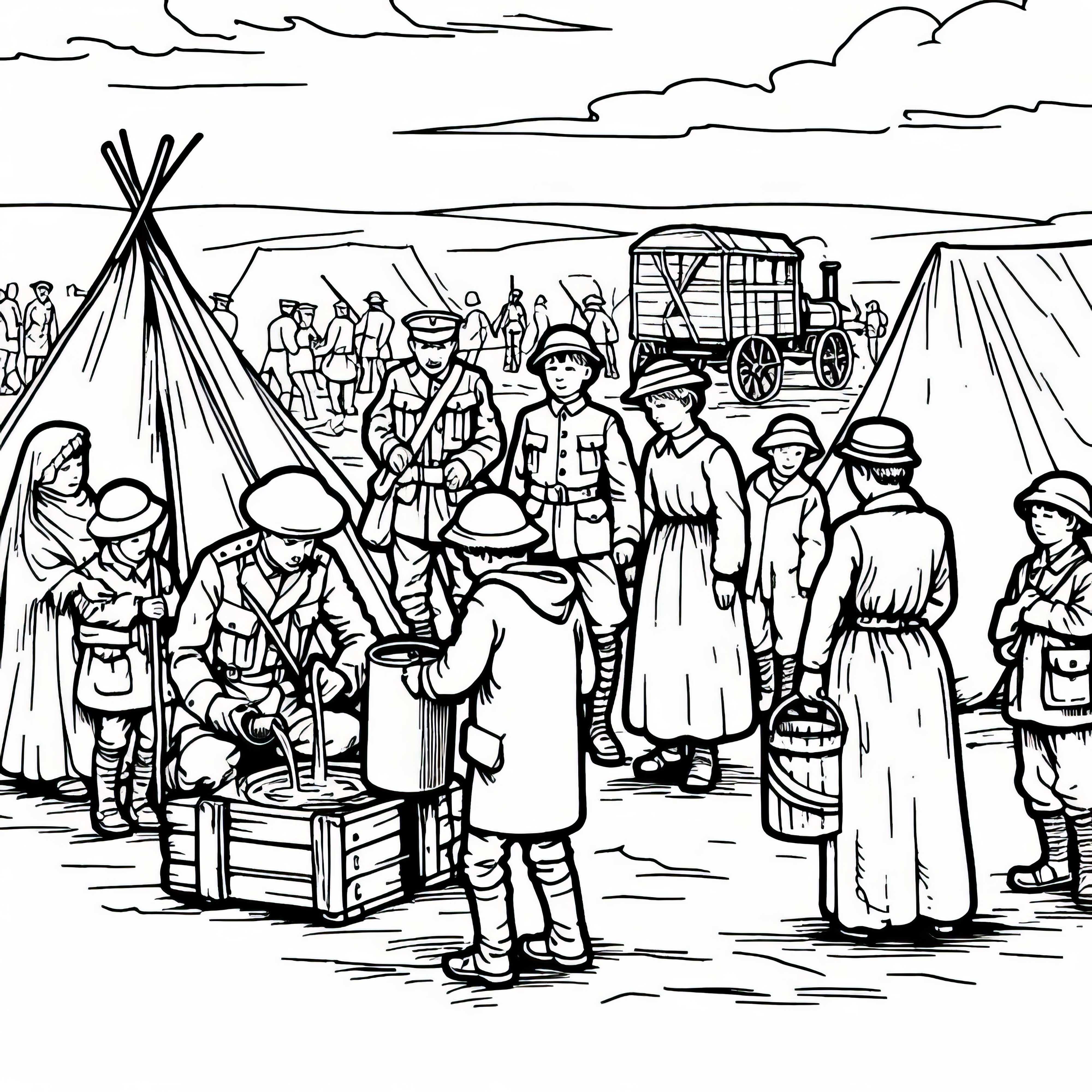 Полеви лагери: Децата помагат при носенето на вода – Безплатен шаблон за оцветяване на исторически битки