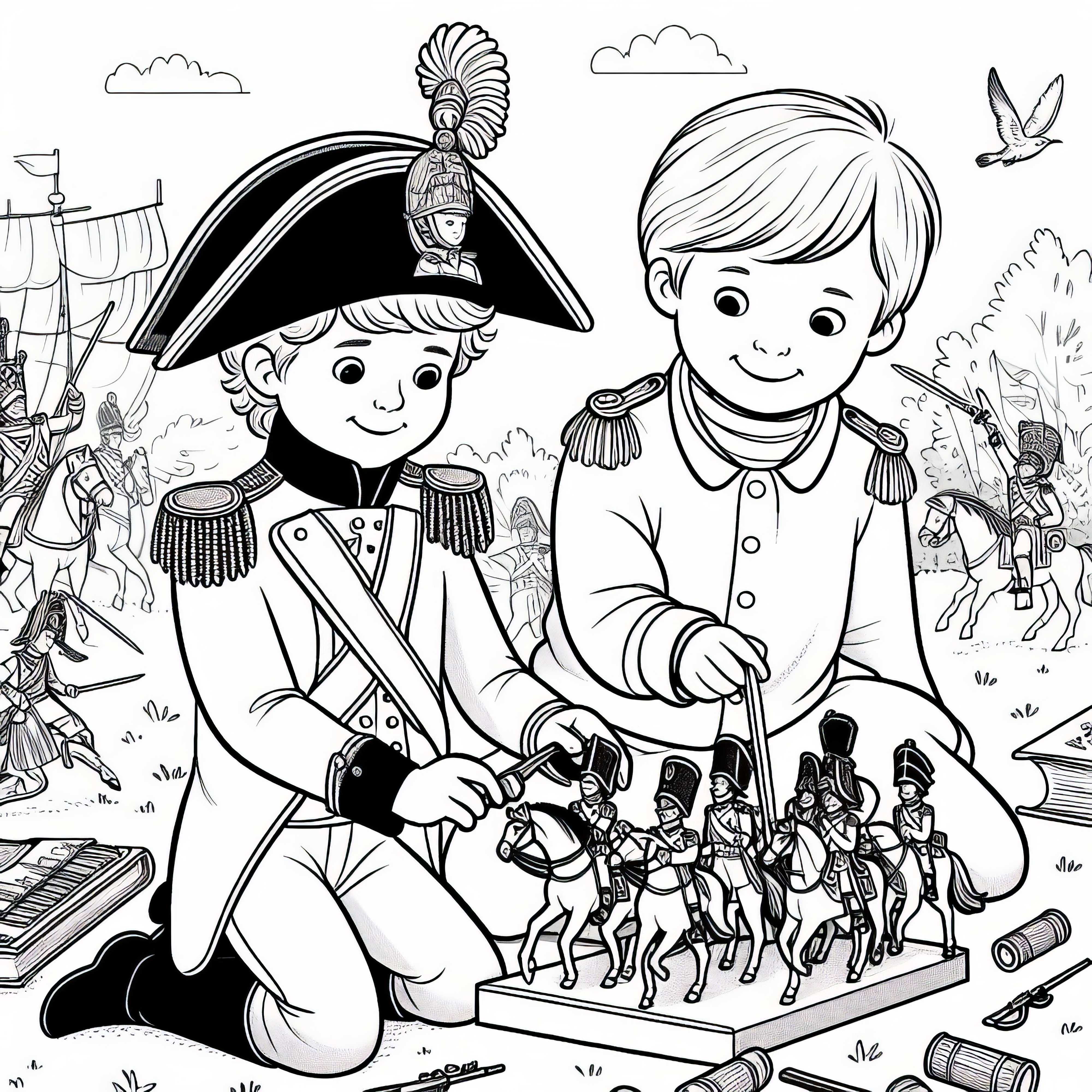 Децата играят Наполеоновата кампания с оловни фигурки – Безплатна оцветяваща картина на исторически битки