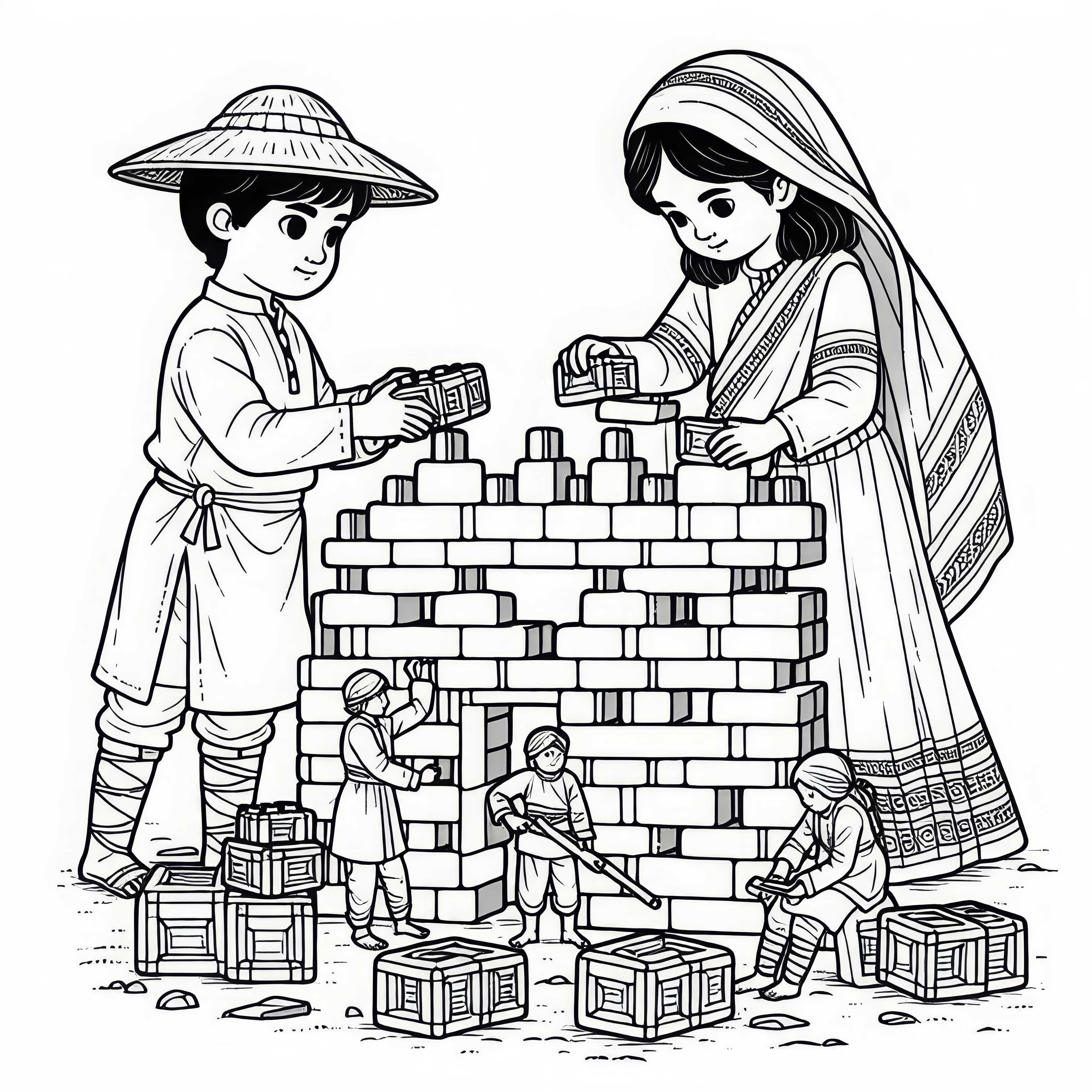 Децата строят от строителни блокчета мини-опори по шаблон за оцветяване на исторически битки безплатно