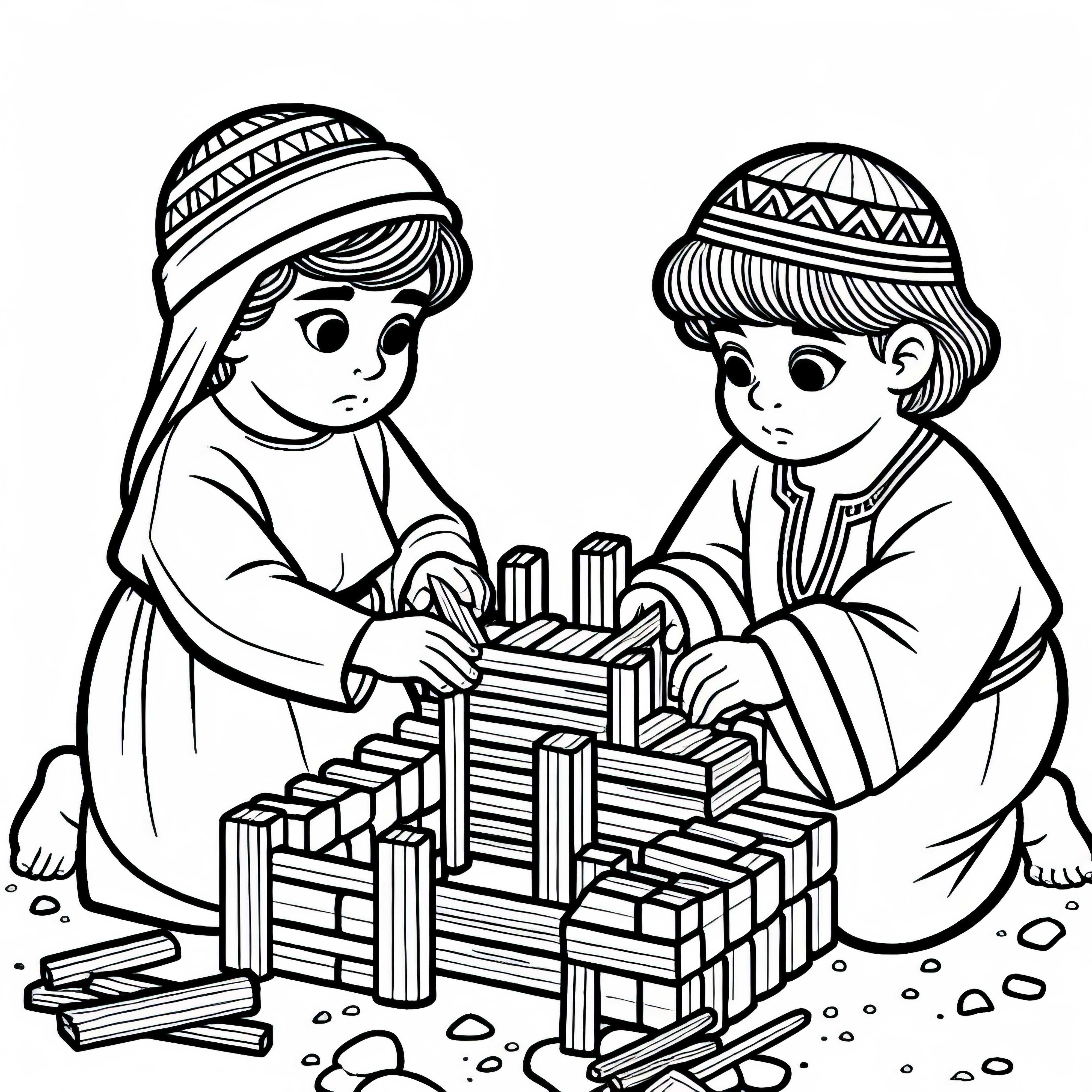 Деца строят малка градска порта от дърво по хетитски образец – Оцветяваща страница за хетити безплатно