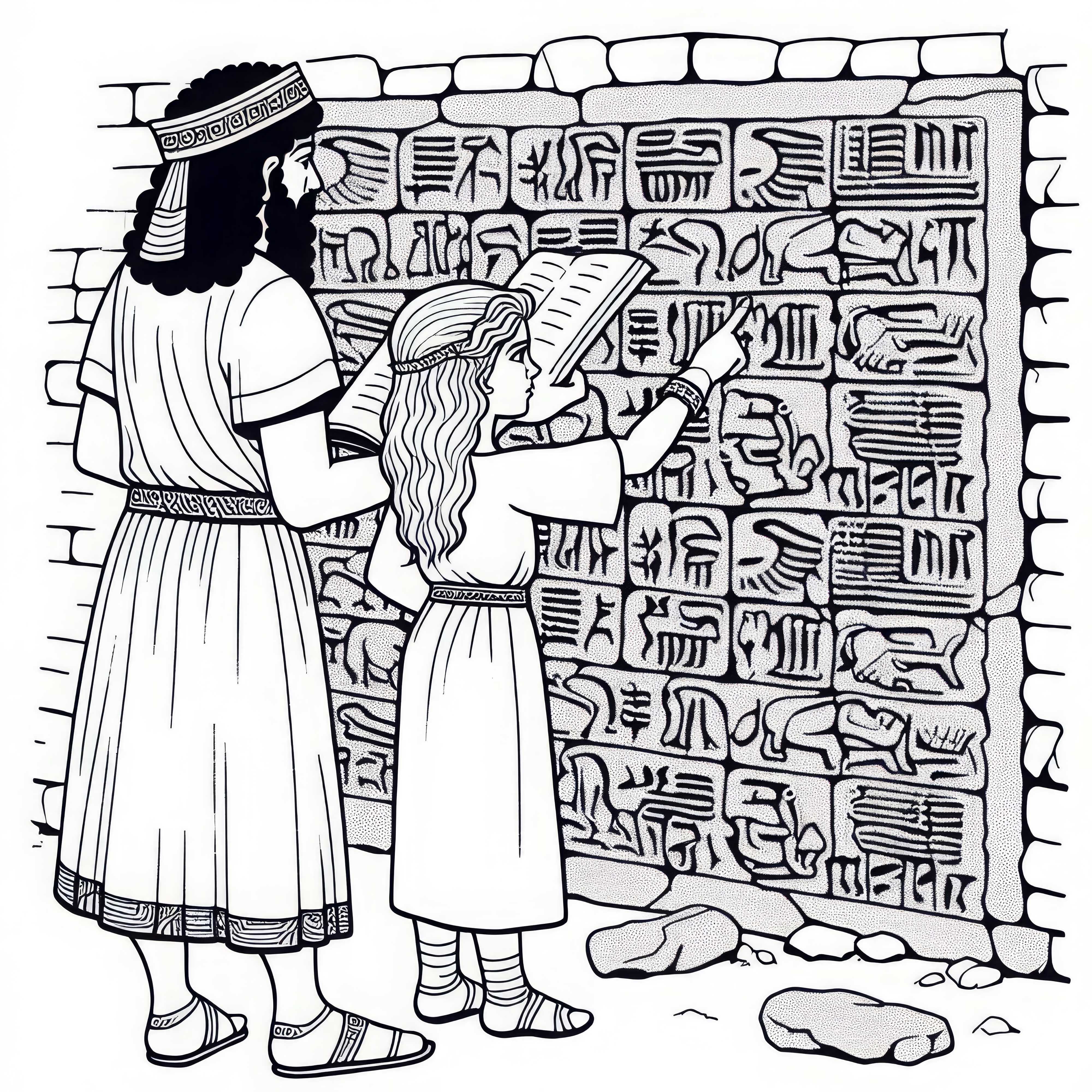 Момче пише със дървено пръчица знаци на глинена плоча - безплатен шаблон за рисуване Хетити