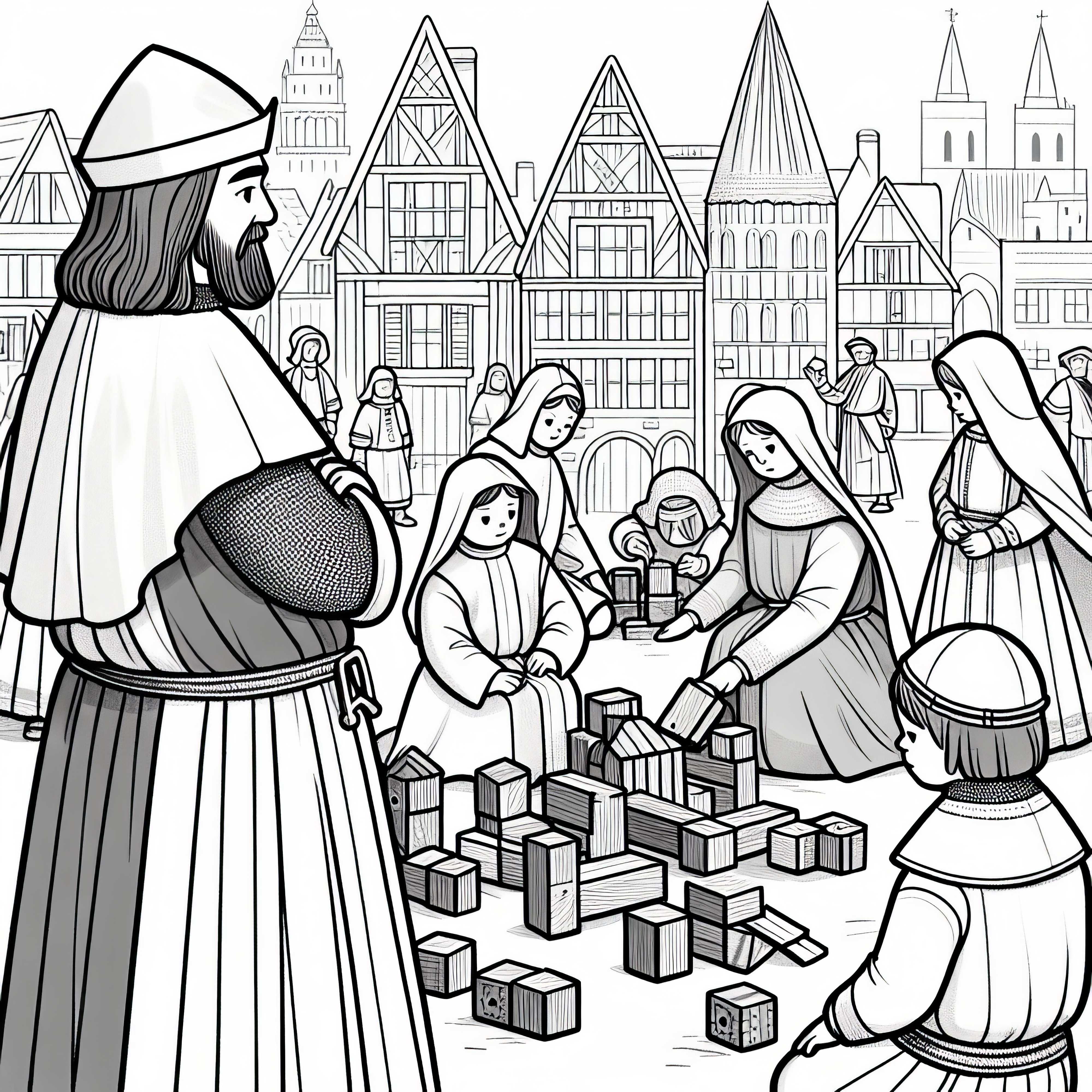 Децата строят малка болница от дървени блокчета, вдъхновени от Йоанитите. Оцветяваща картина на рицарски орден безплатно