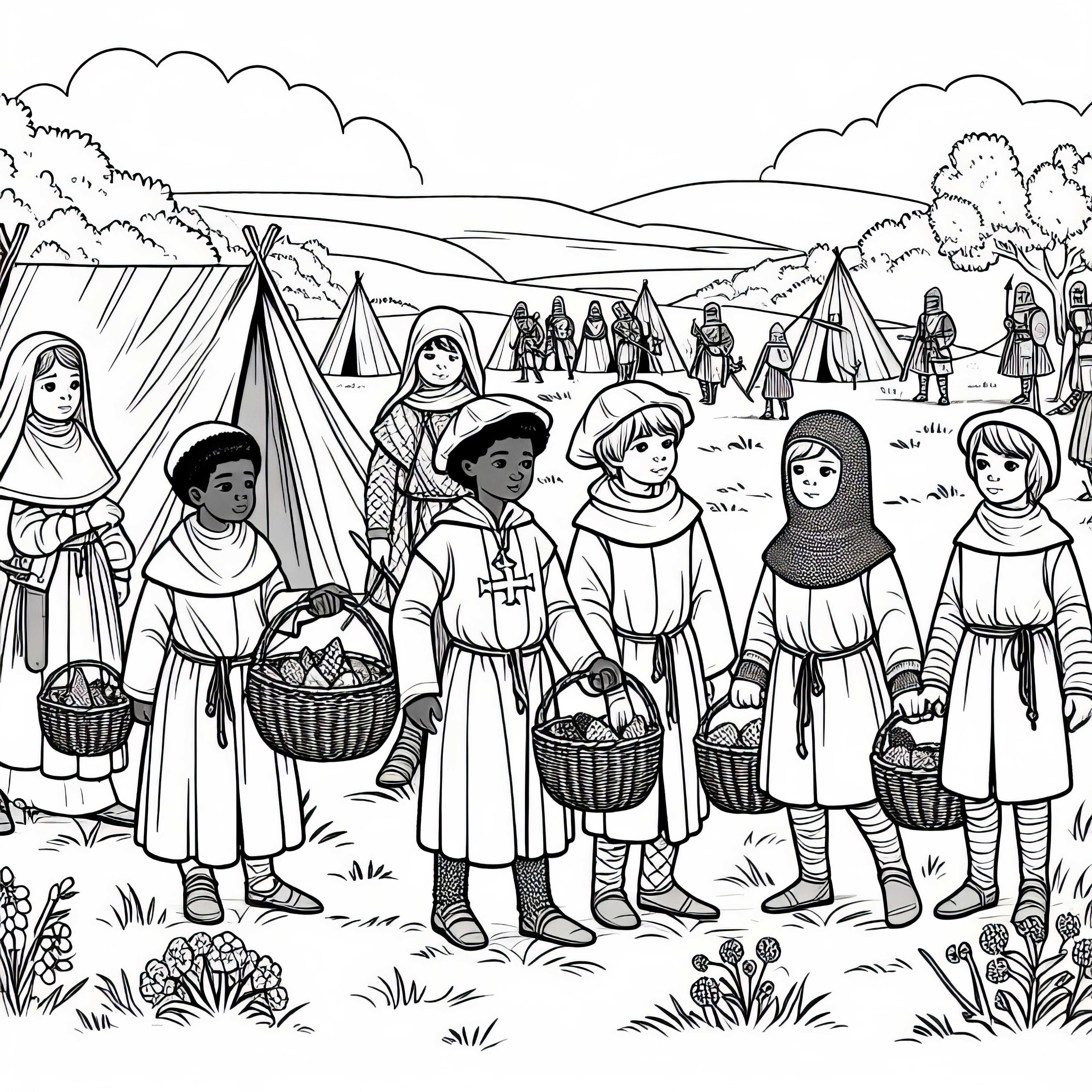 Децата носят малки кошници с хляб до складово място - Изображение за оцветяване на рицарски орден безплатно