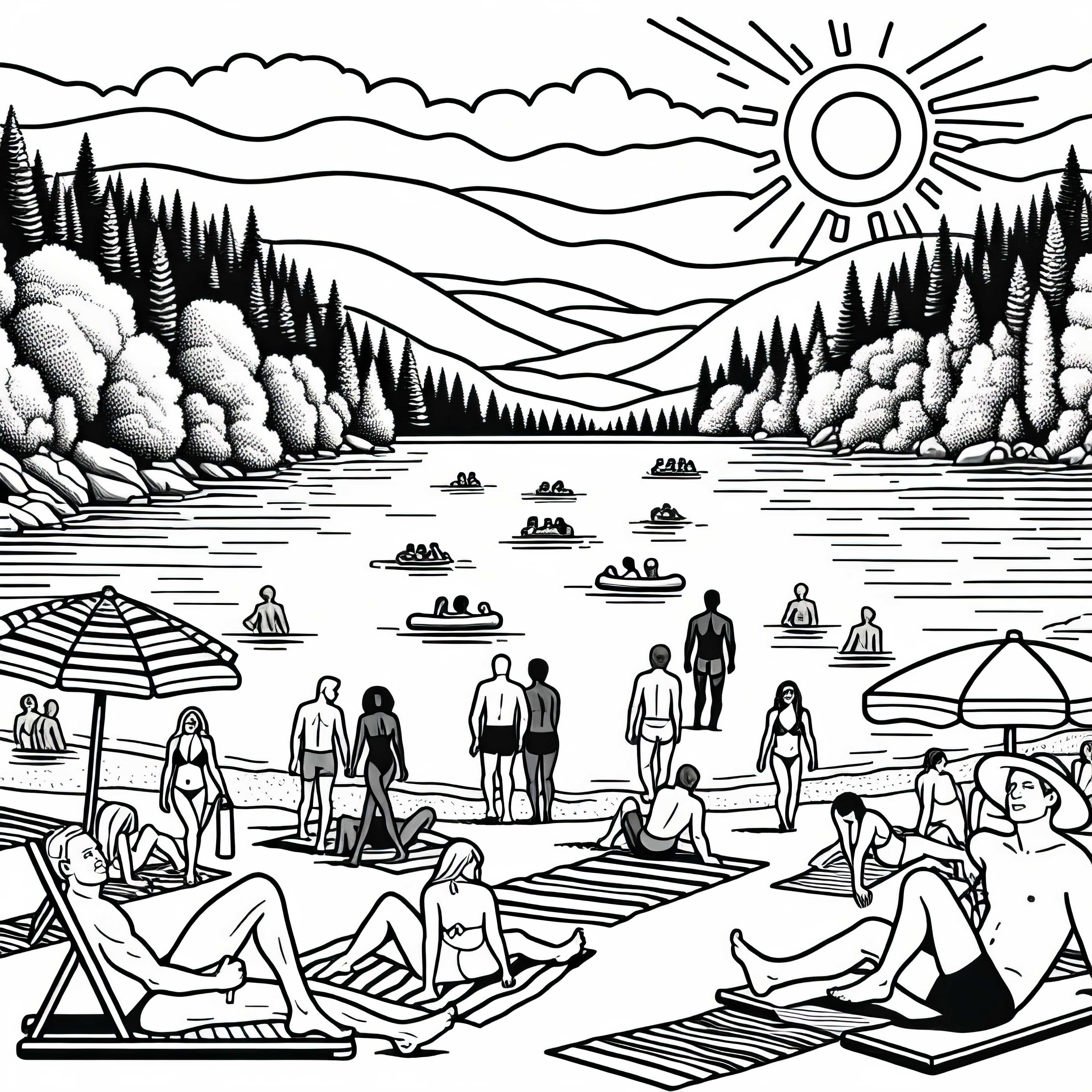 Деца играят на брега на езерото – безплатна картинка за оцветяване
