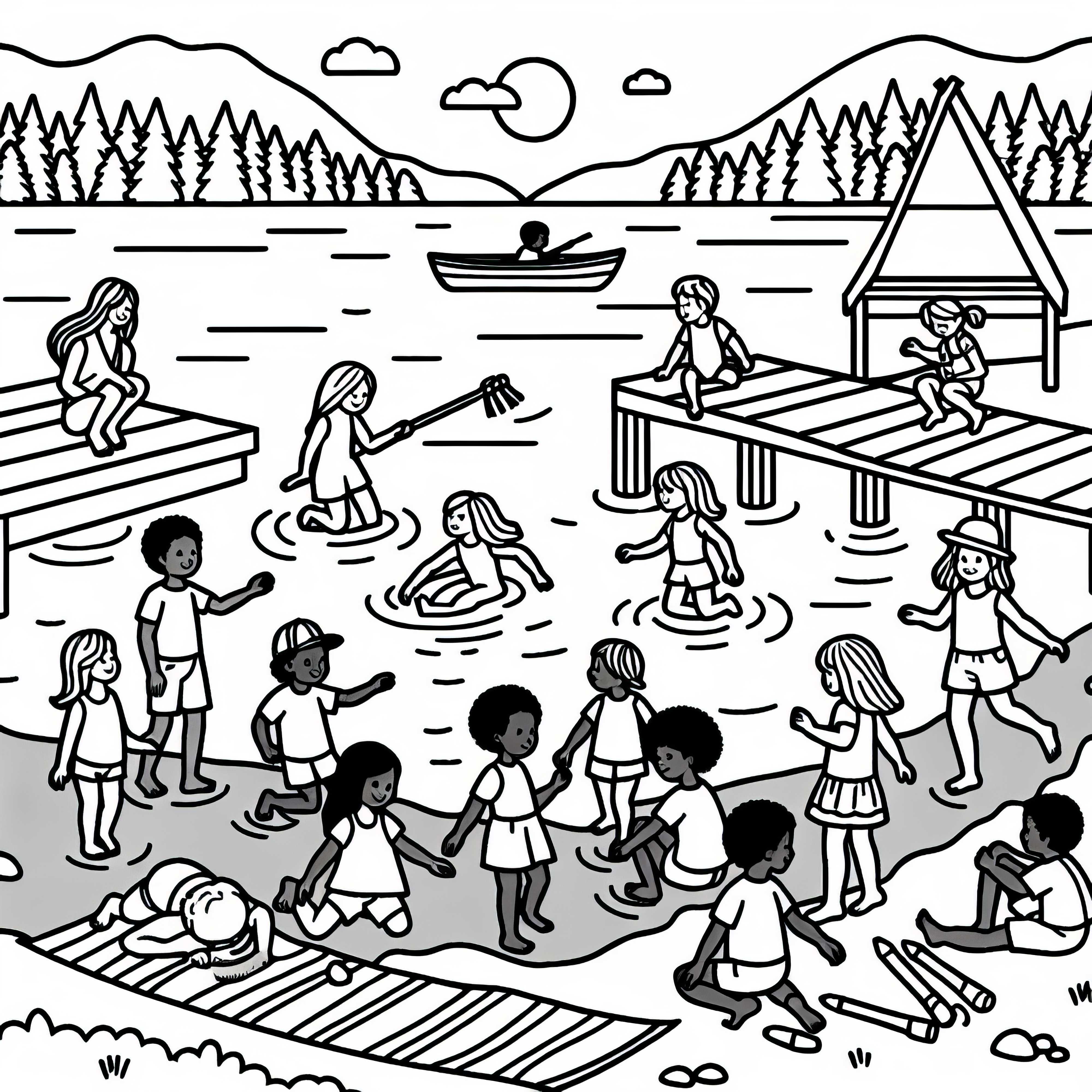 Слънчев залив за къпане на езеро с хора като безплатен шаблон за оцветяване