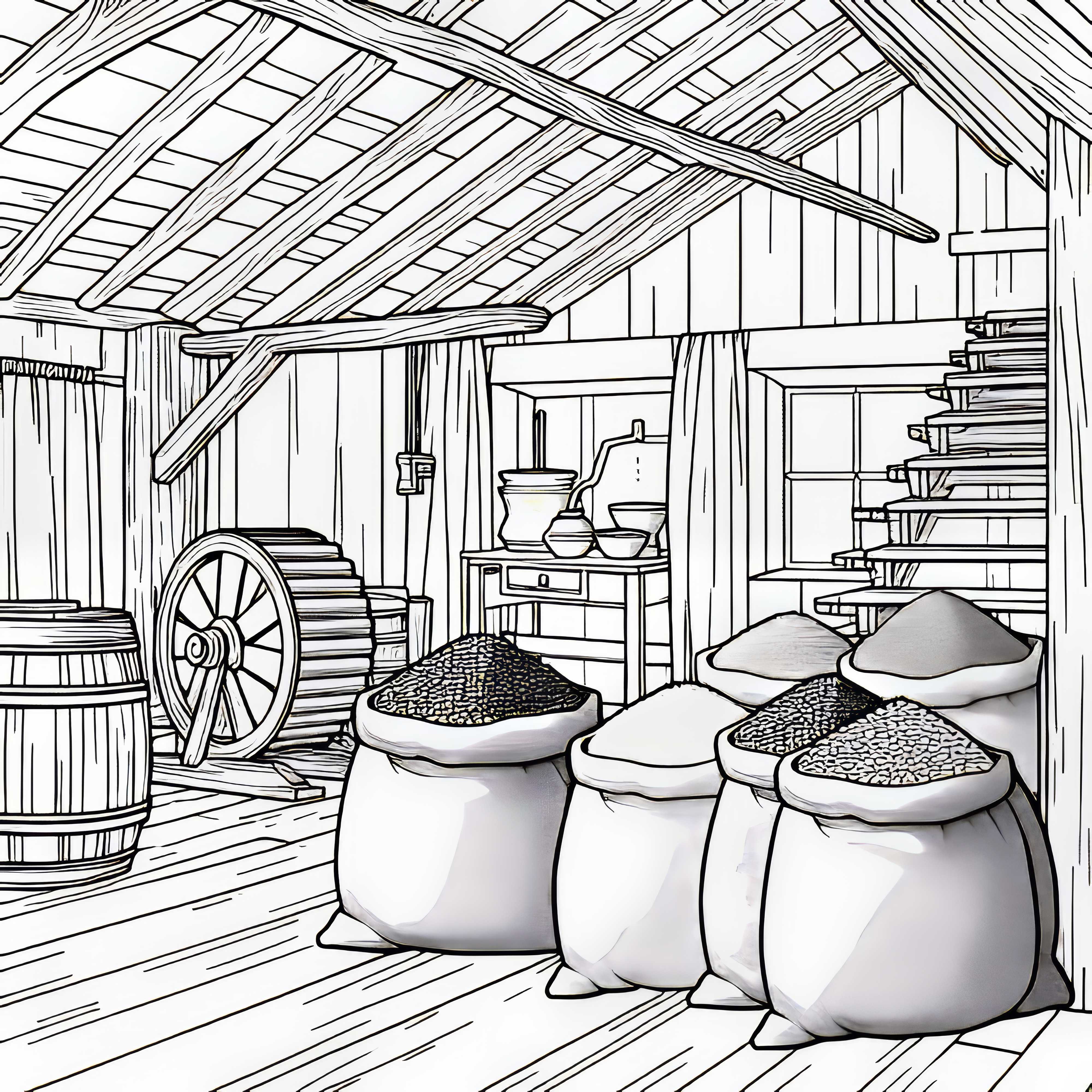 Фермери пренасят чували с брашно с конска wagon до мелницата - Безплатна картинка за оцветяване