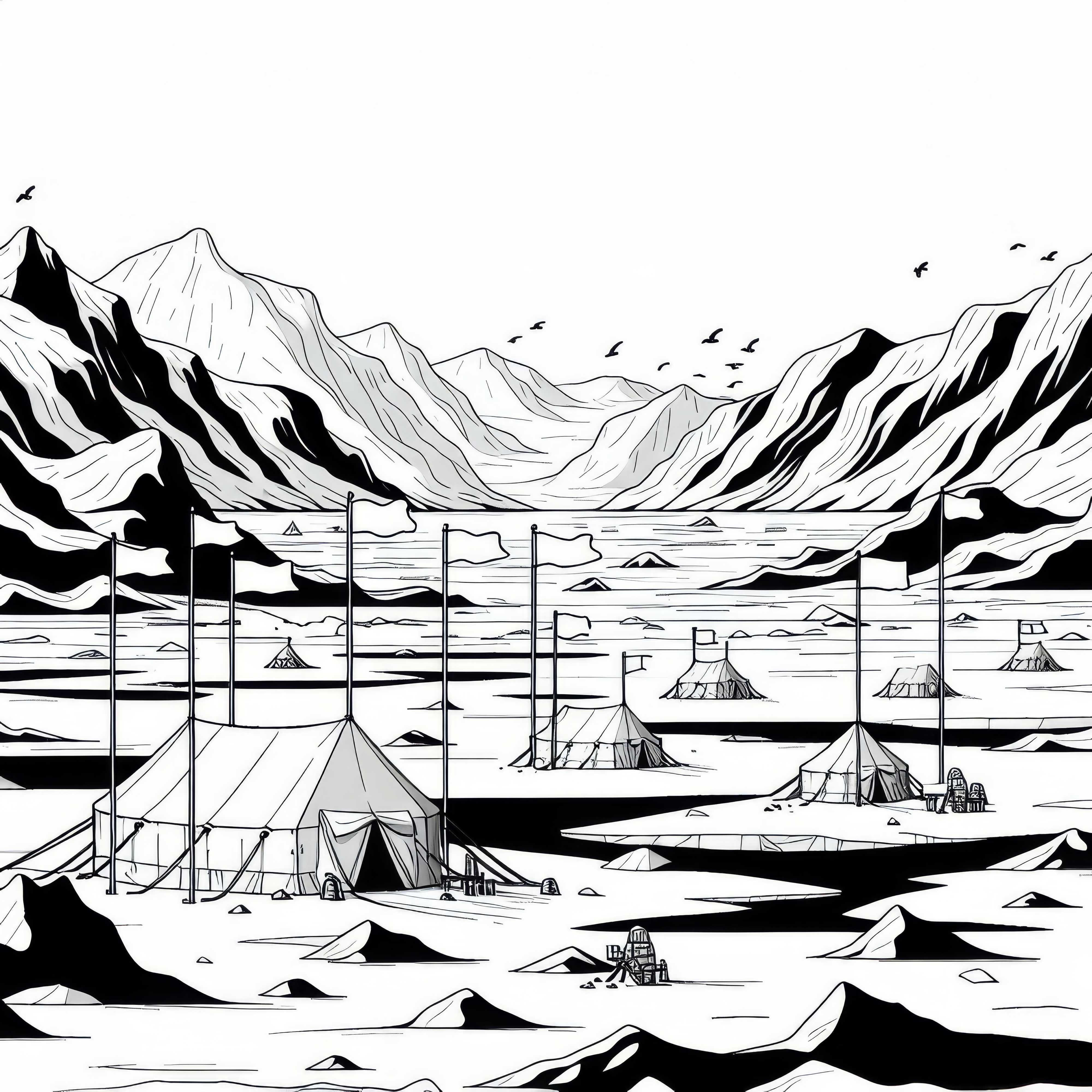Снежна равнина с айсберги на хоризонта – Безплатна оцветяваща страница