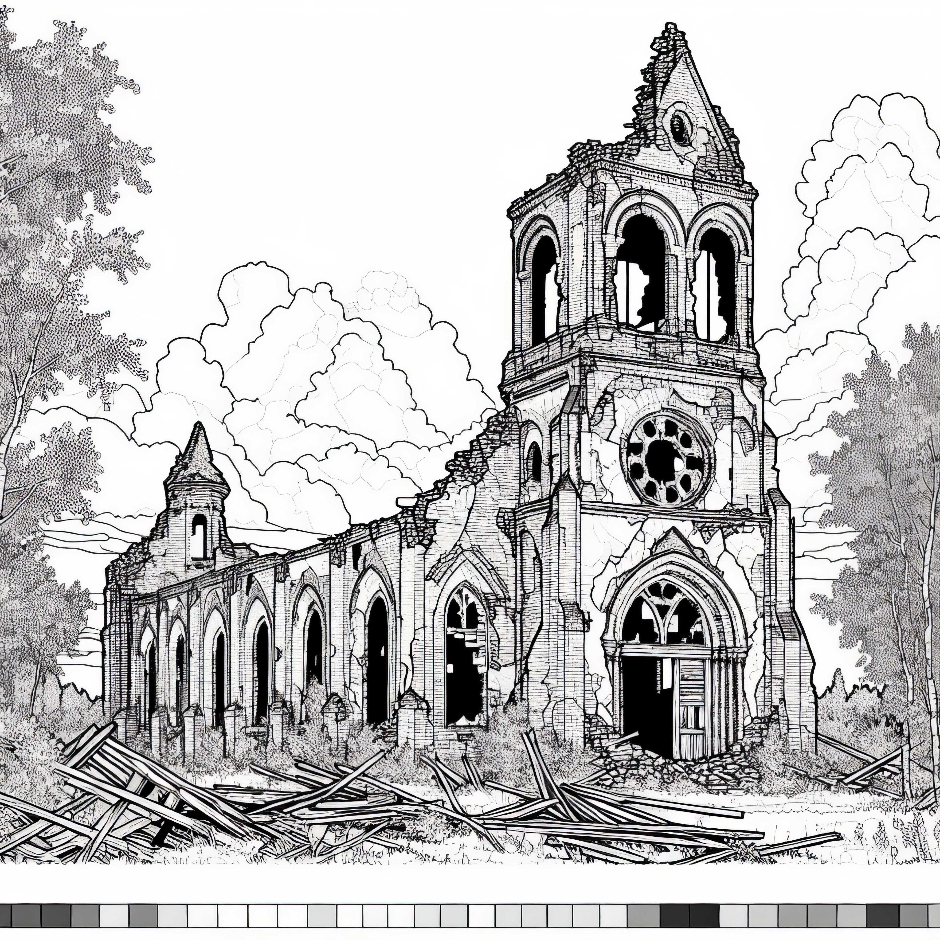 Изоставена църква с счупени прозорци – Оцветяваща картина на руина Безплатно