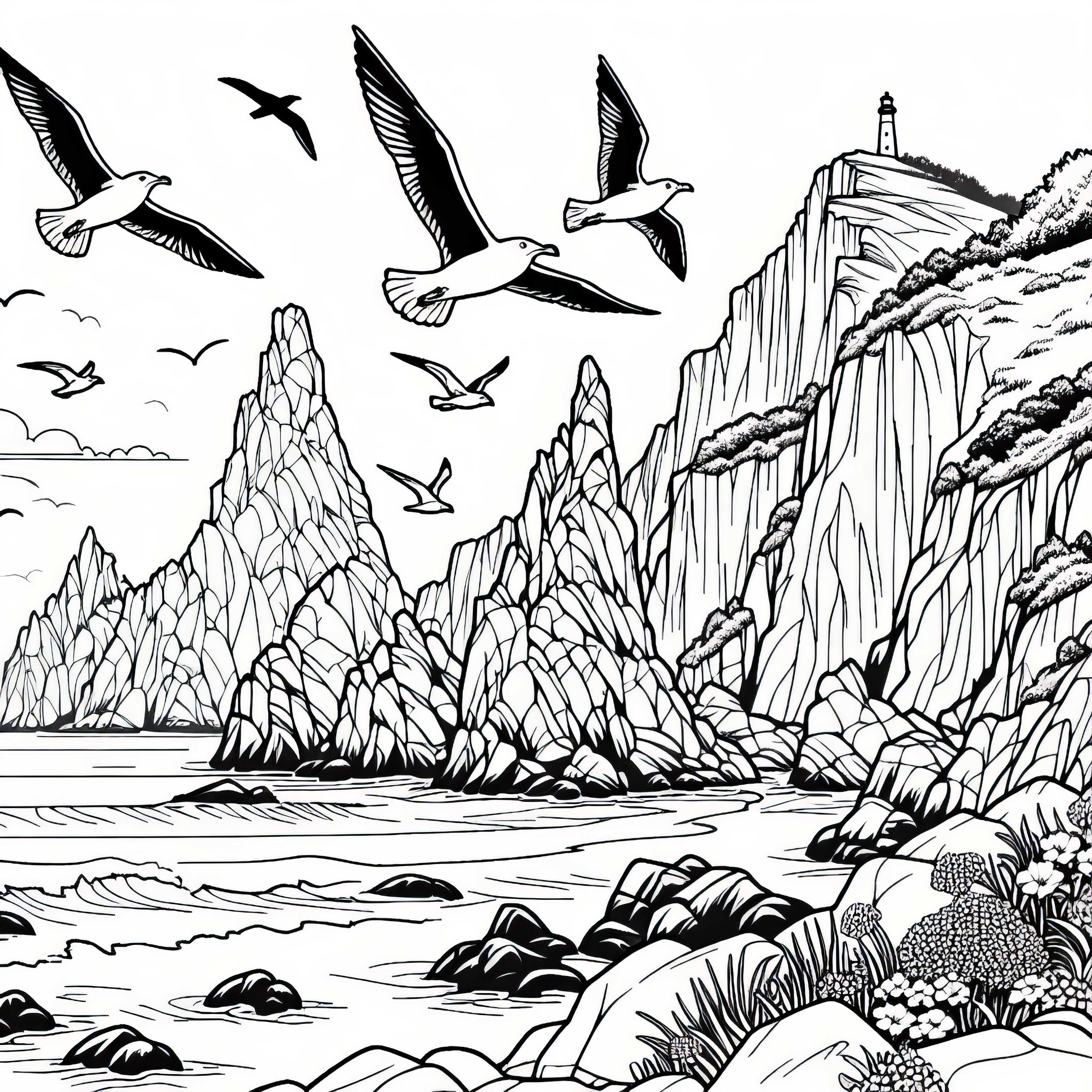 Залез над стръмен скалист бряг - безплатен шаблон за оцветяване