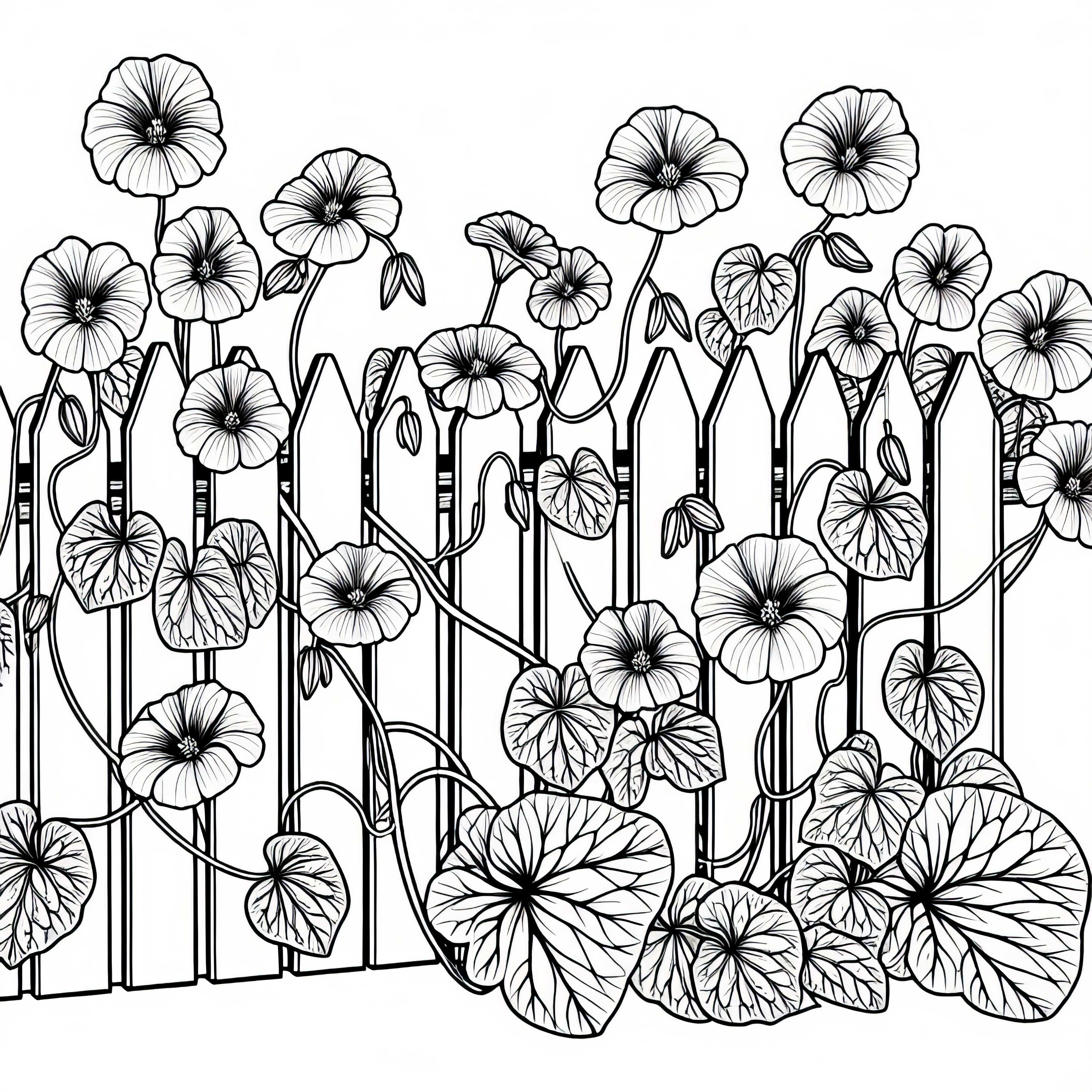 На изображението виждаш негъсната цветя, която се изкачва по дървена ограда. Типични цветове за оцветяване на това растение са ярко жълто, интензивно оранжево и дълбоко червено, комбинирано с наситено зелено за листата. Изтегли изображението безплатно като JPG файл, за да го разпечаташ или оцветиш онлайн. Внеси цвят в живота си!
