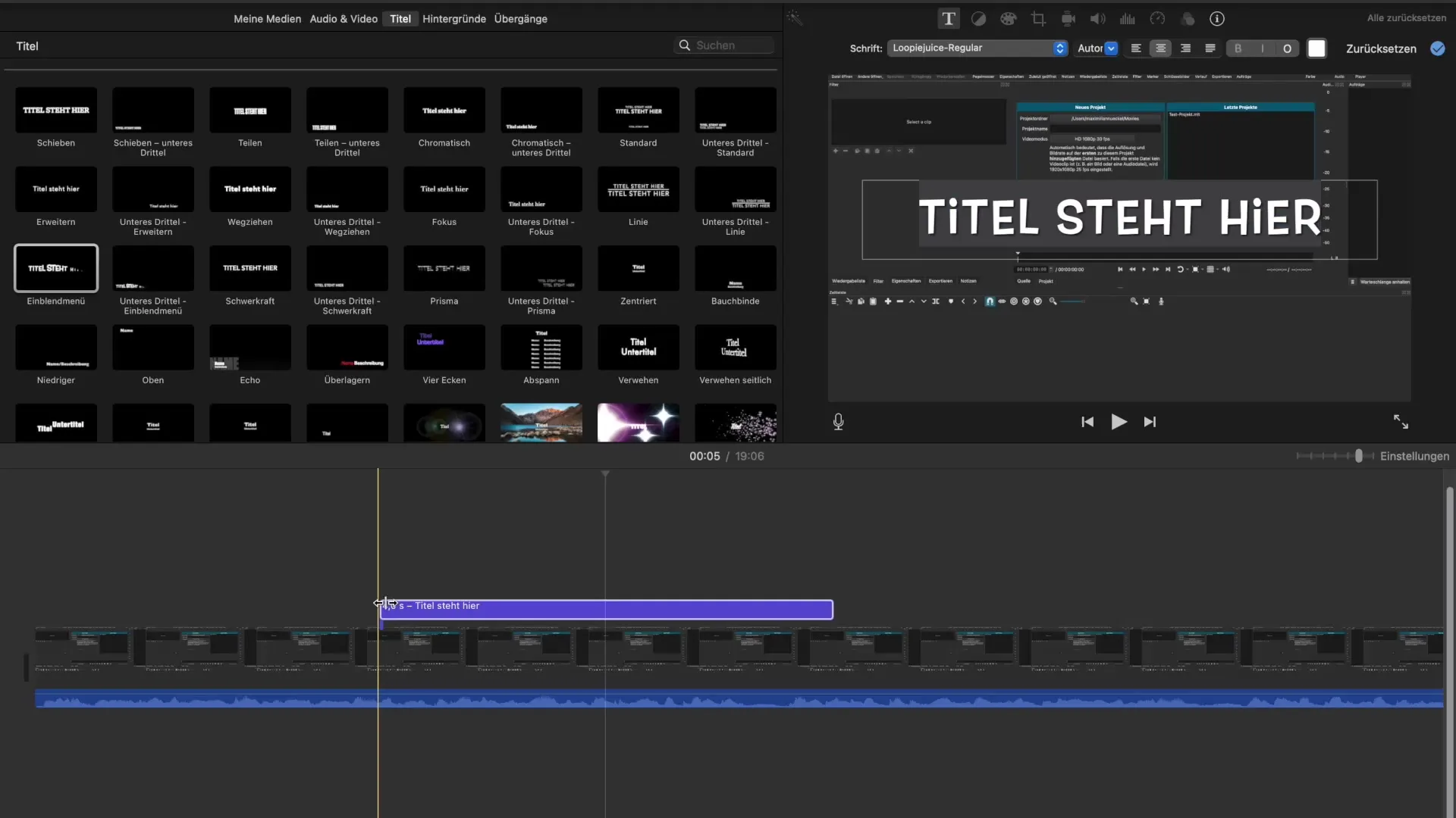 Избери шаблон за заглавие, който ти харесва. Кликни върху него и го плъзни в таймлайна, на мястото, където заглавието трябва да се появи. По време на избора ще се покаже син бар, който ще ти покаже колко дълго заглавието ще бъде видимо. Стандартната настройка е често за около четири секунди, но можеш да го настроиш.