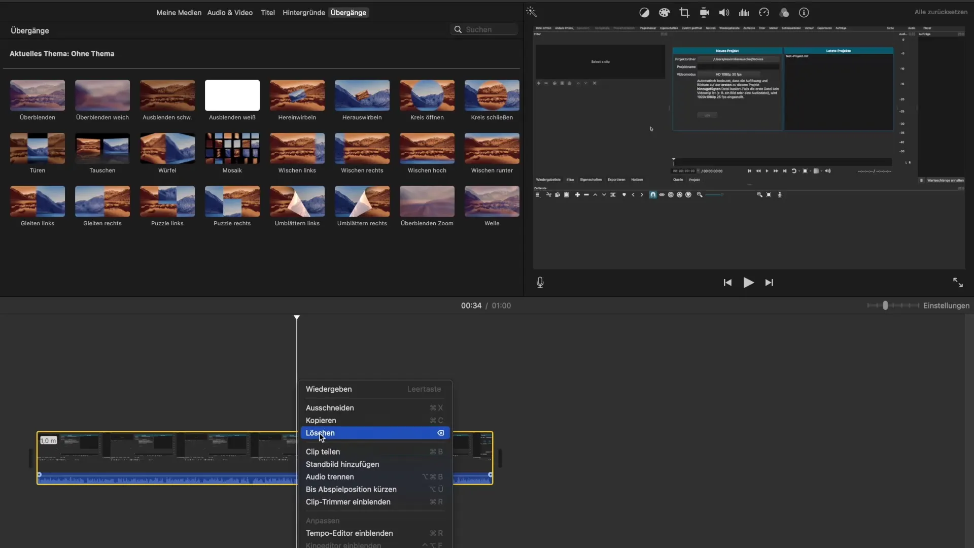 Ако искаш да премахнеш клип от видеото си, можеш да го направиш или чрез Command + X, или чрез опцията „Изтриване“ в менюто с десен клик. Тази функция премахва избрания елемент, докато останалата част остава както преди.