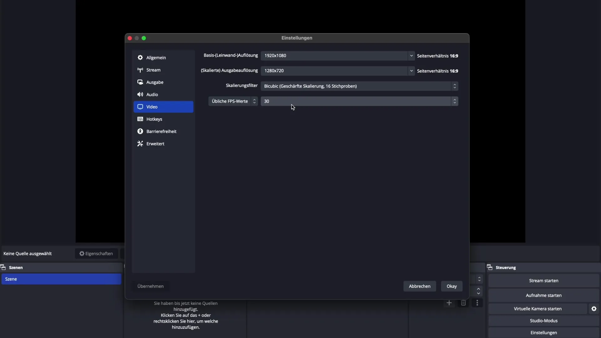 В настройките на OBS можеш също да регулираш качеството на записите си. Помисли дали искаш да запишеш в 30 FPS или 60 FPS; с резолюция 1920 x 1080 си добре подготвен за повечето съдържание. Много от настройките вече са оптимално предварително зададени, така че можеш да използваш основите веднага.