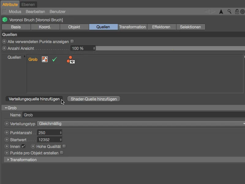 По подразбиране обектът „Voronoi разлом“ разполага с Генератор на точки като източник на разпределение, който може да настроим чрез параметрите по-долу. Както подсказва вторият бутон, можем да използваме и Шейдъри за оформянето на разломите. Освен това, в принцип можем да дефинираме всички обекти, които генерират точки в Cinema 4D, както например сплайнове, полигонови обекти, генератори или дори емитери на частици, като източник посредством „добави и пусни“.
