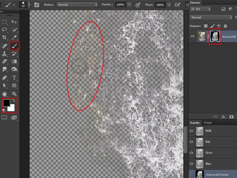 Ако сега погледнете отблизо към снимката, ще видите, че водопадът не е напълно изрязан и има останали сиви останки. Те трябва да бъдат премахнати сега.
