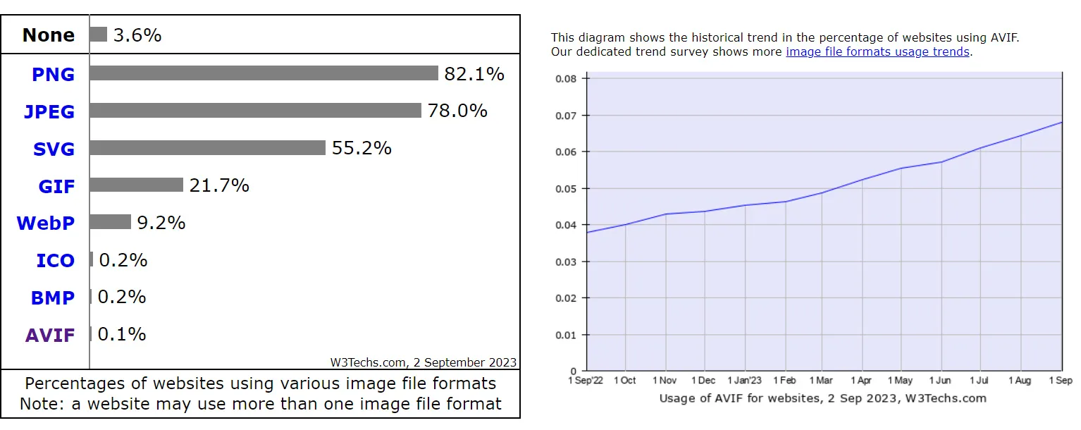 Aktuálně tedy méně než 0,07 procenta všech webových stránek používají formát AVIF. Whaaat? To je stále směšně málo. Ale hej, je to šance pro vás, stát se technologickou špičkou při používání moderních obrázkových formátů. Jak je patrné z grafu v pravém obrázku, použití se zvyšuje každý měsíc ... stále v rozsahu promile. To se jistě brzy zrychlí.