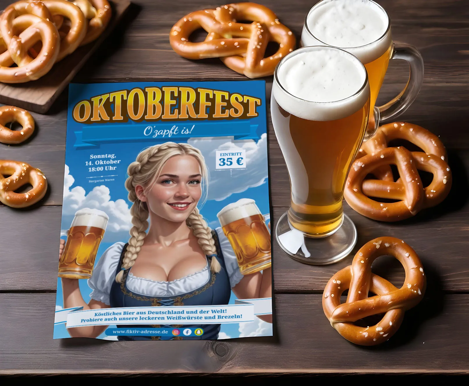 Chcete atmosféru Oktoberfestu přenést i do vaší eventové síně nebo do vašeho města? Pak začněte přípravami hned teď! Například se postarejte o cool plakát, na který se každý bude rád vrátit! Skvělý poster je klíčem k úspěchu (s mnoha eury v kapse a prázdnými sudy na konci festivalu).