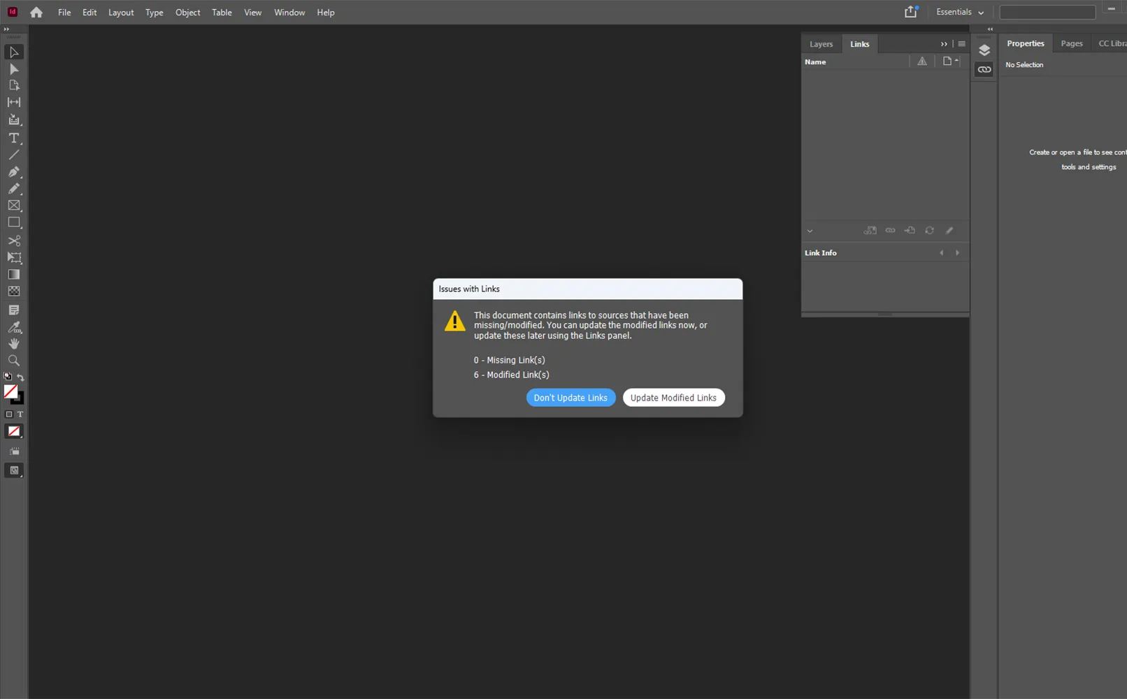 Když otevřeme stažený soubor, přejdeme do složky InDesign a spustíme program. Po jeho otevření se zobrazí okno žádající aktualizaci odkazů na obrázky. Postupujeme dál kliknutím na tlačítko „Pokračovat“.