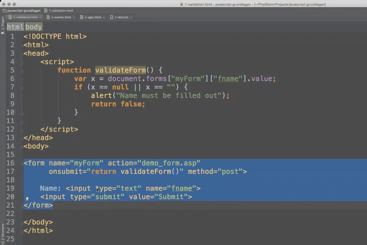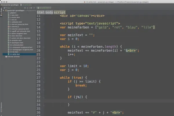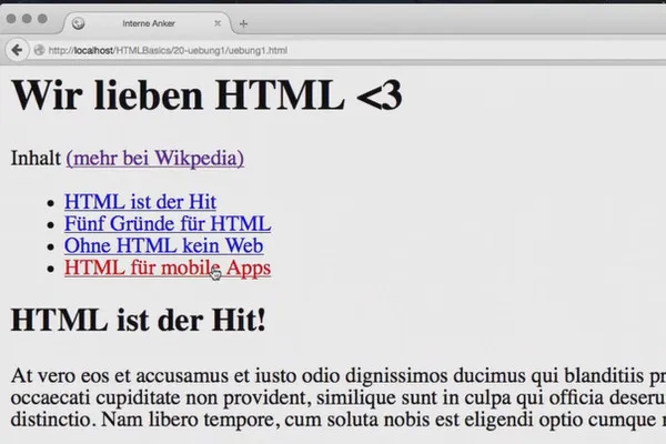 Kurz se dělí na tři hlavní bloky HTML, CSS a JavaScript. V každém bloku najdete různá témata, která se zabývají konkrétním hlavním tématem. Poté, co zjistíte, o co vlastně jde v HTML, se naučíte strukturu HTML dokumentů, vytvoříte hyperlinky, rozdělíte své dokumenty pomocí nadpisů, zástupců, odstavců, seznamů a tabulek a nakonec budete schopni integrovat i další prvky, jako jsou obrázky, iframes nebo JavaScript.
