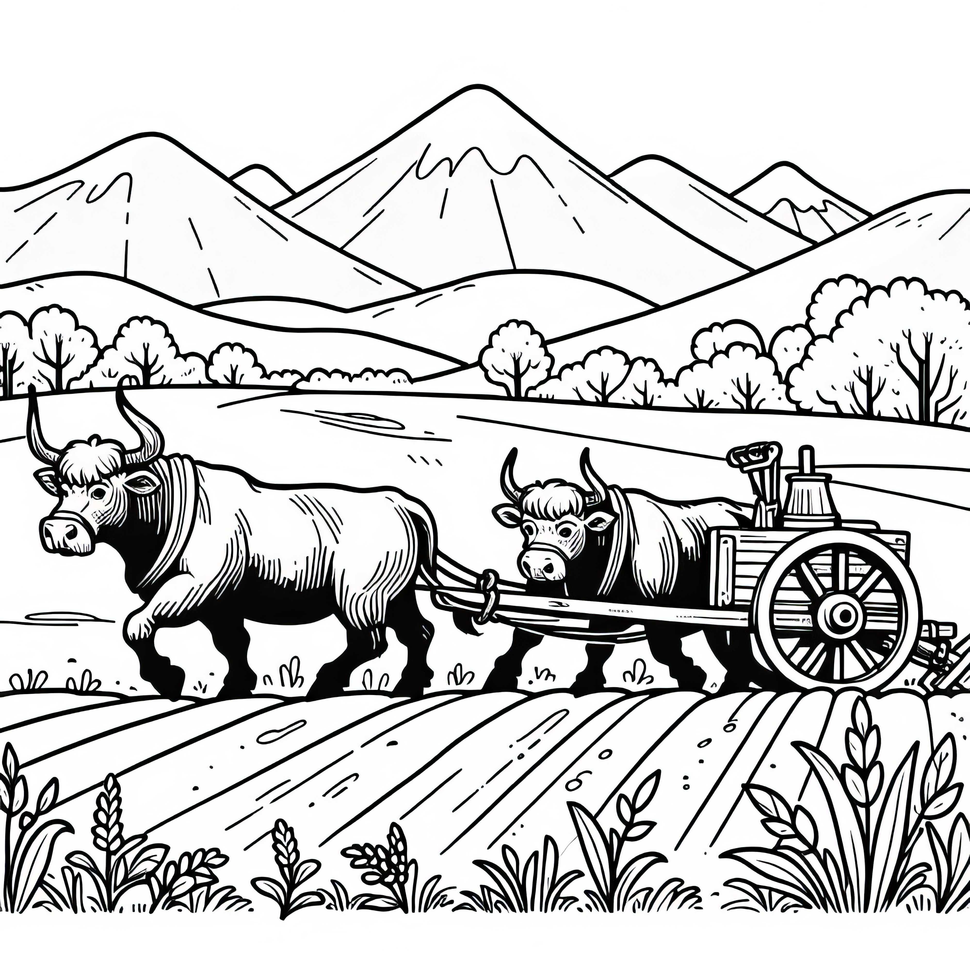 Býk táhne těžký dřevěný vůz po cestě – omalovánka zdarma