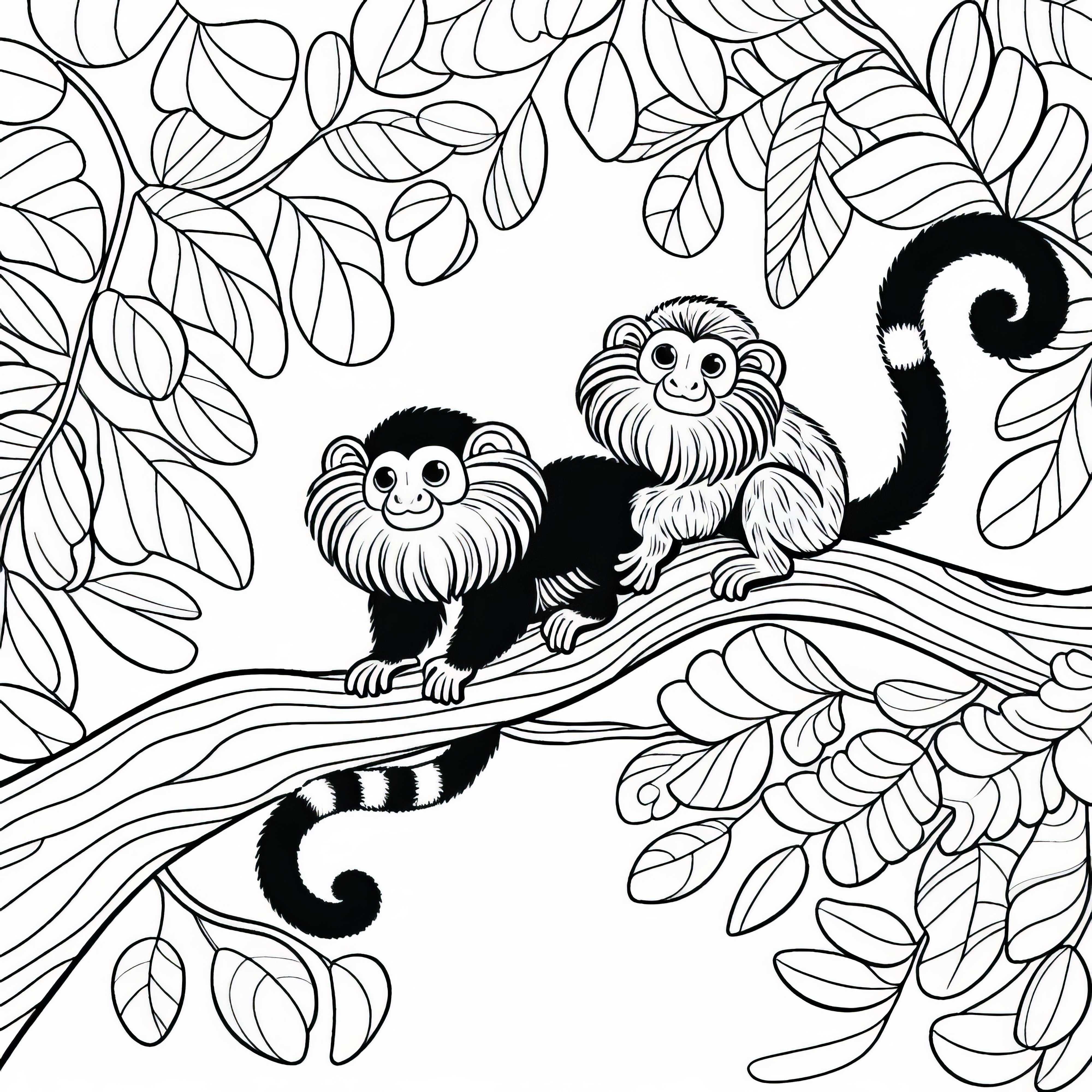 Skupina tamarinů šplhá mezi liánami – omalovánka zdarma