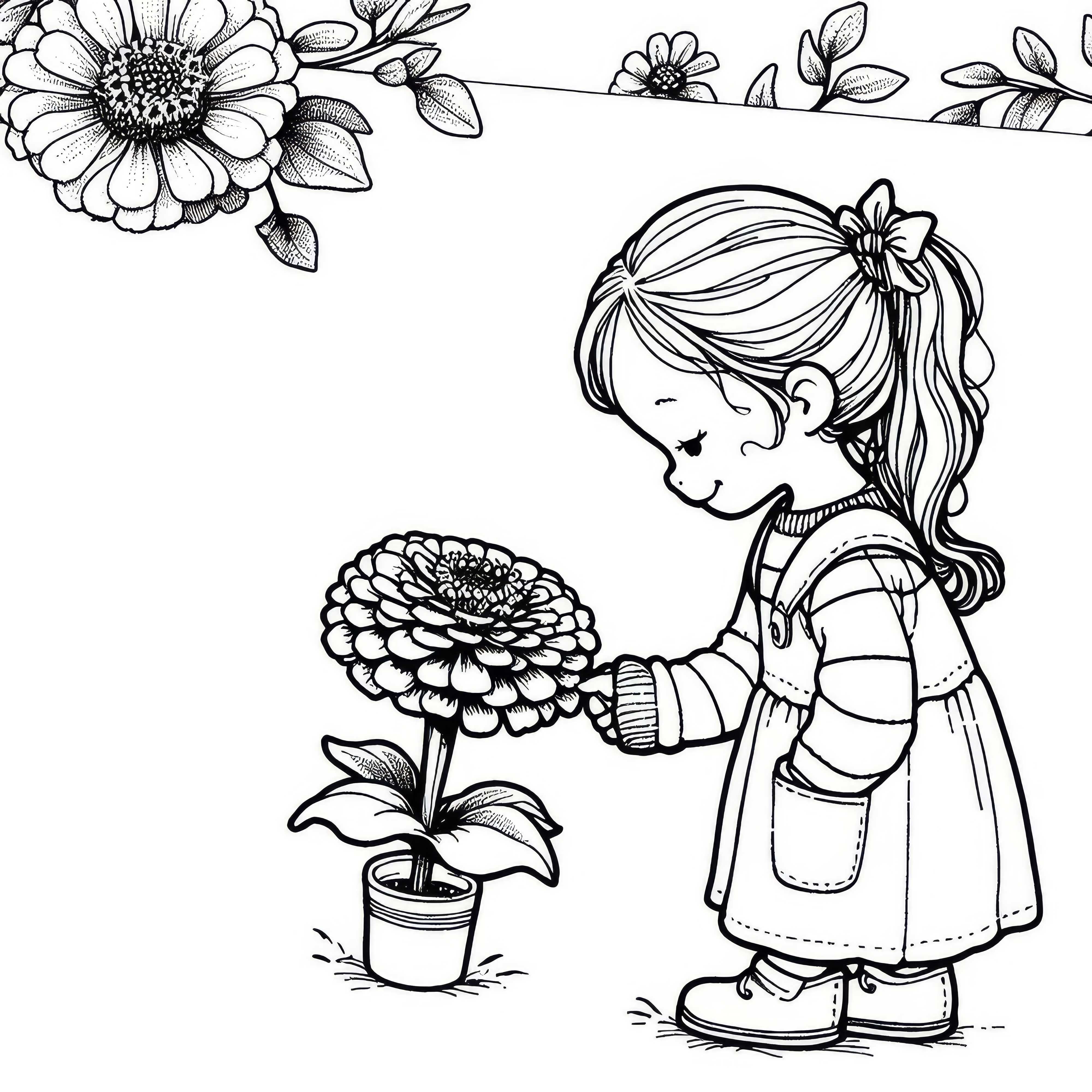 Dítě trhá květinu Zinnia - Malovací obrázek zdarma