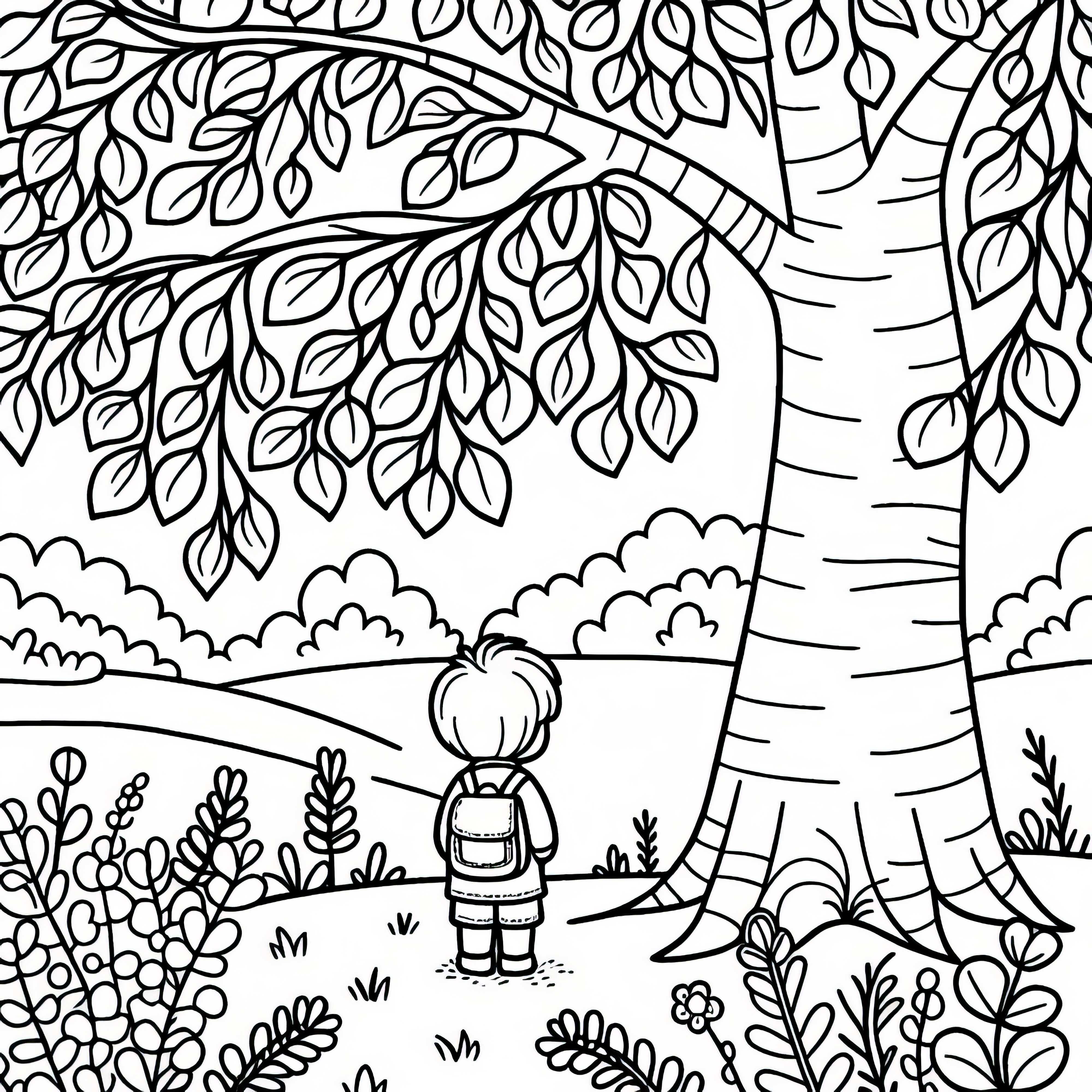 Dítě stojí pod gleditschií - omalovánka zdarma