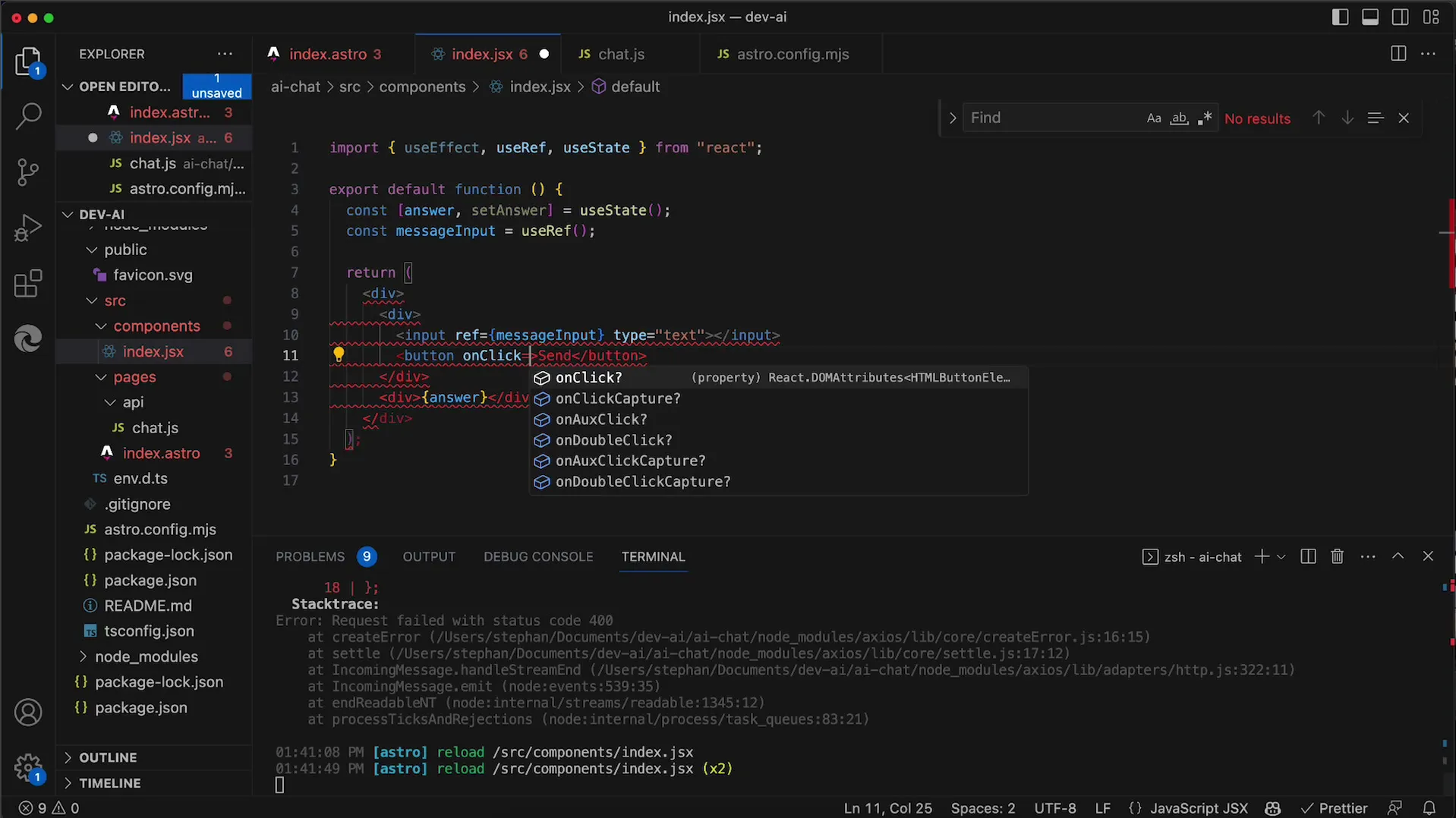 Nejprve chcete přidat vstupní pole, kam uživatel může zadat svou zprávu. To jim umožní interagovat s AI. Takže přidejte vstupní pole a tlačítko pro odeslání požadavku.