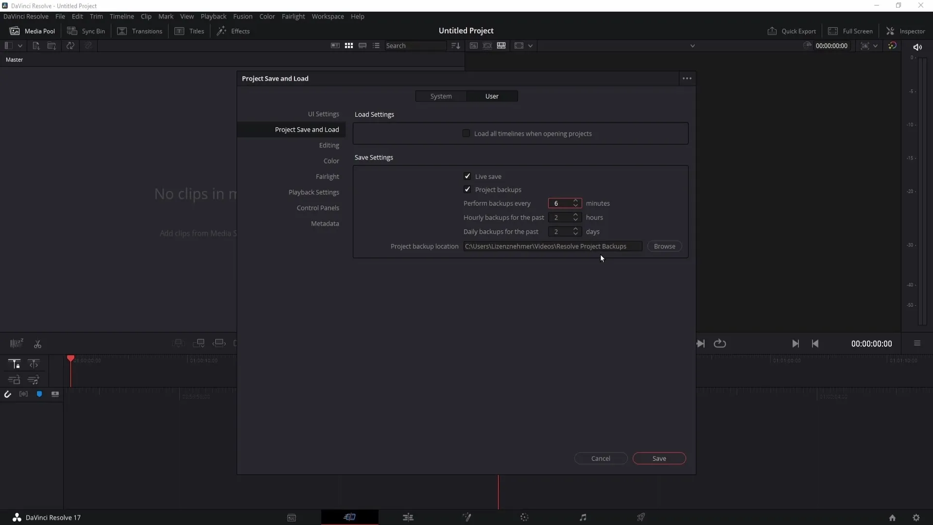 Jak nastavím, aby DaVinci Resolve pravidelně vytvářel zálohy?Přejděte na "Preferences", vyberte "User" a nastavte zálohovací možnosti pod "Project Save and Load".