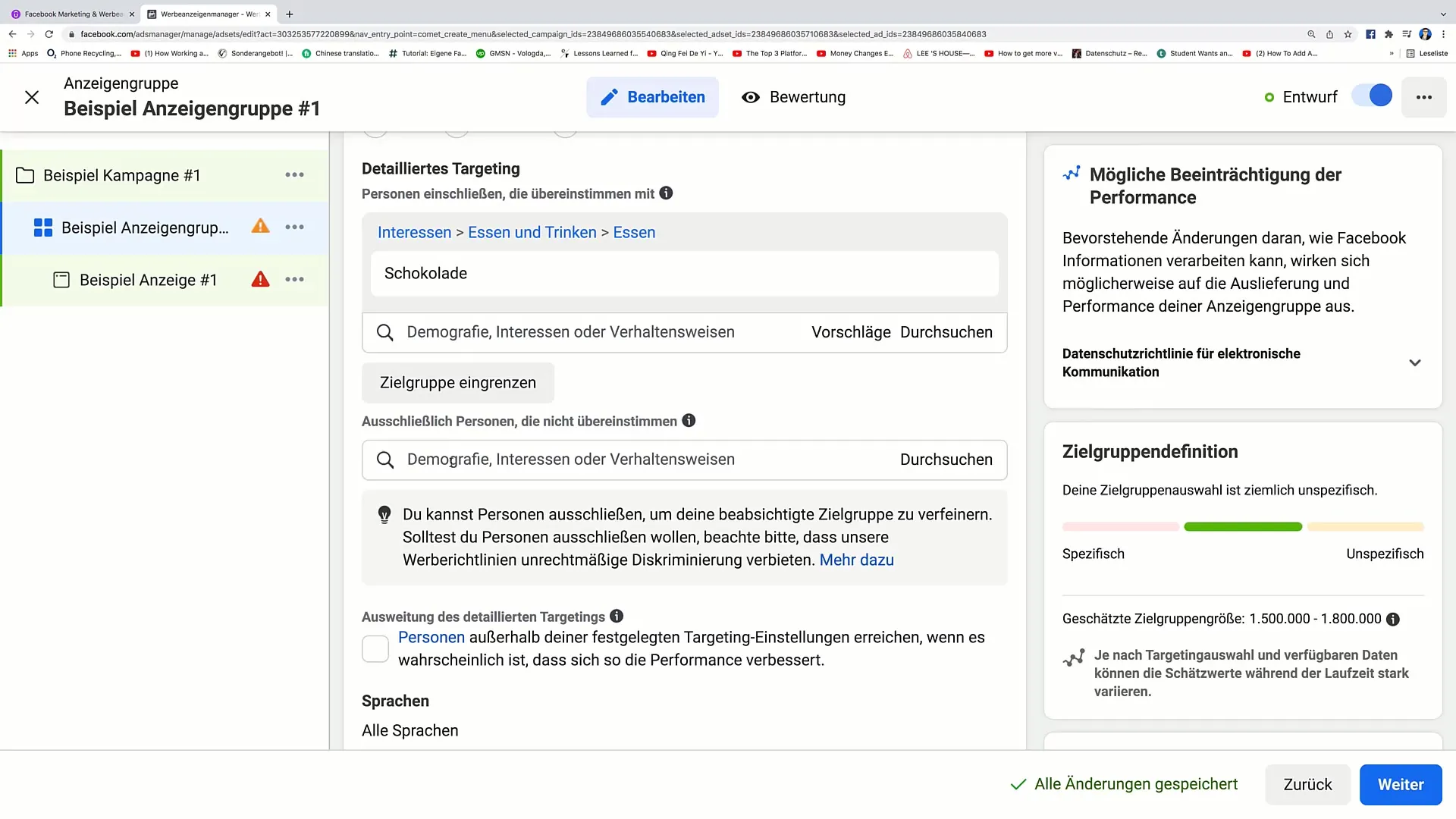 Klikněte na „Detailní cílení“, abyste přidali specifické zájmy, demografické údaje nebo chování. Pokud je například vaše cílová skupina zajímána o čokoládu, zadejte tento termín a vyberte odpovídající zájmy.