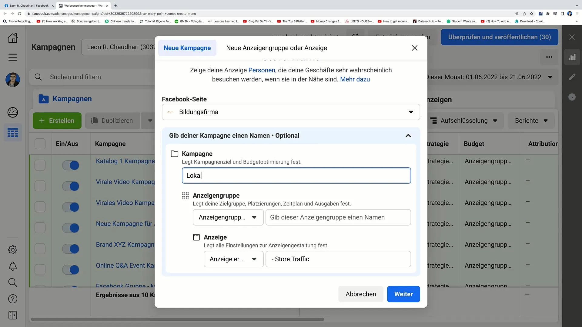 Nejprve otevři manažer reklam na Facebooku. Klikni na „Store Traffic“, abys začal s tvorbou tvé místní reklamy. Tady začínám s základními nastaveními.