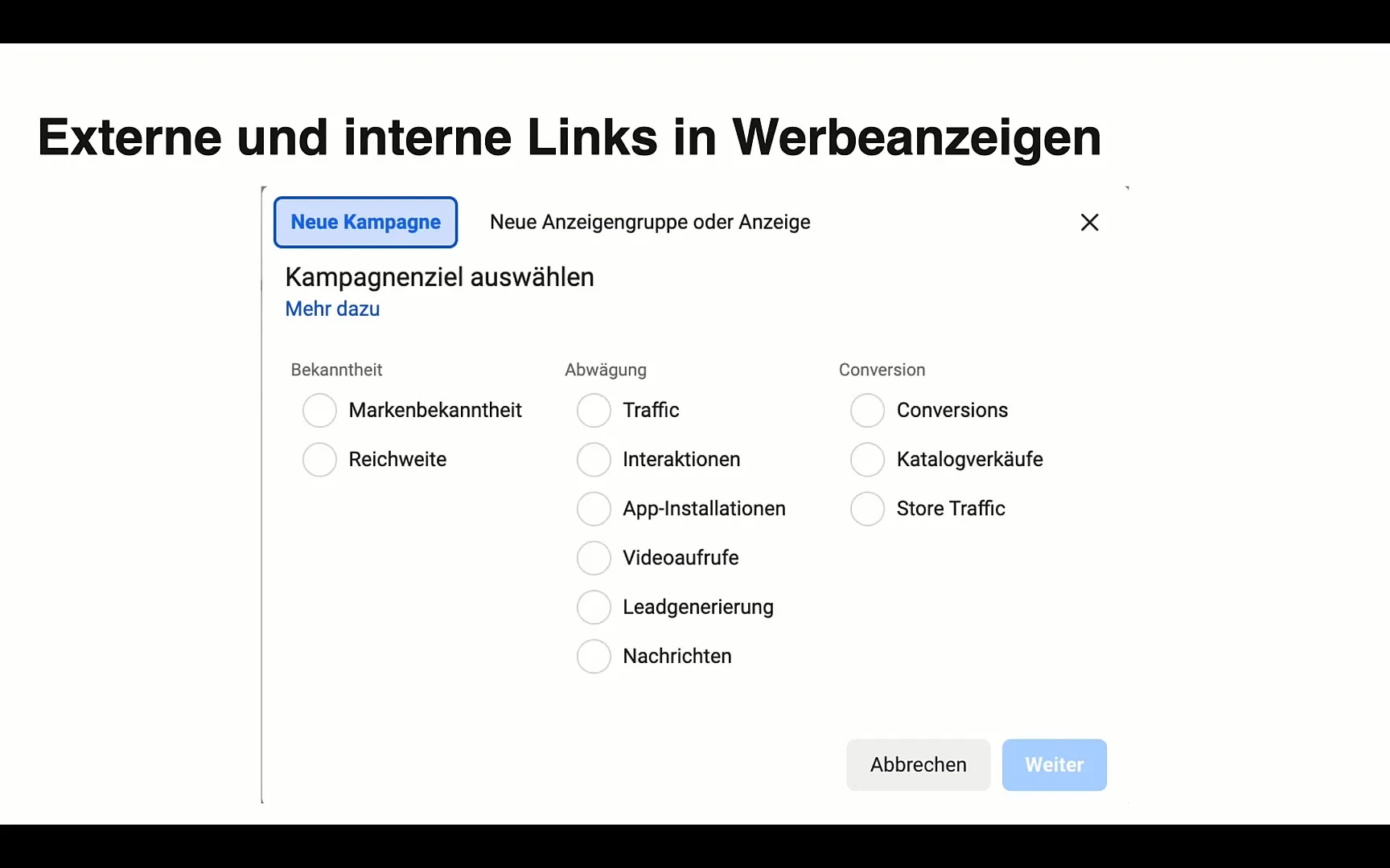 Předtím, než začnete s vašimi reklamami, měli byste porozumět rozdílu mezi externími a interními odkazy. Externí odkaz odvádí uživatele z Facebooku, zatímco interní odkaz udržuje uživatele na platformě. Toto rozlišení je důležité, protože Facebook obvykle preferuje reklamy, které udržují uživatele na platformě.