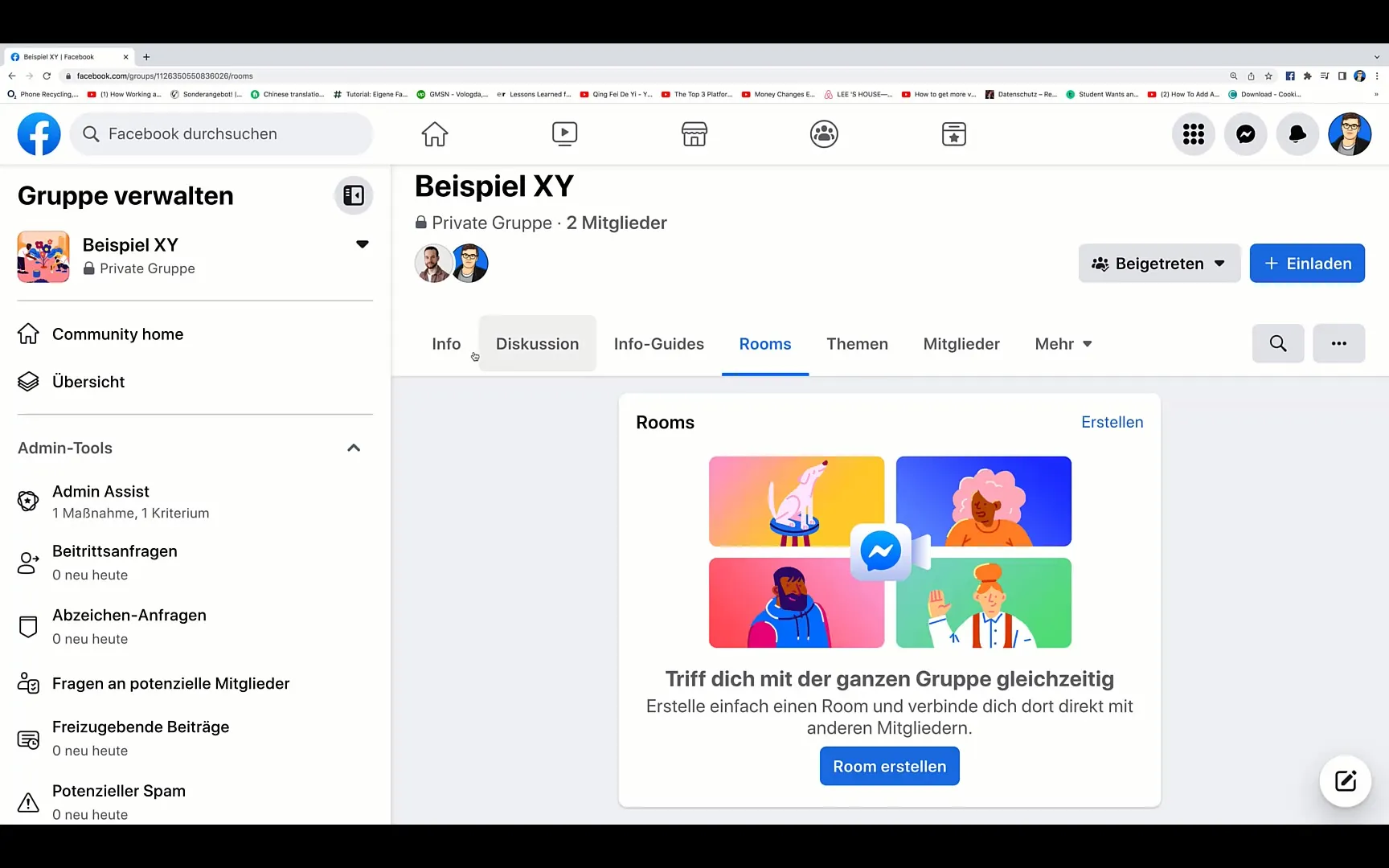 Nejprve se přihlaste do své skupiny na Facebooku. V horní navigaci najdete možnost "Rooms". Jakmile na ni kliknete, budete přesměrováni na přehled všech dostupných Rooms. Pokud jste již dříve vytvořili Room, uvidíte jej zde.