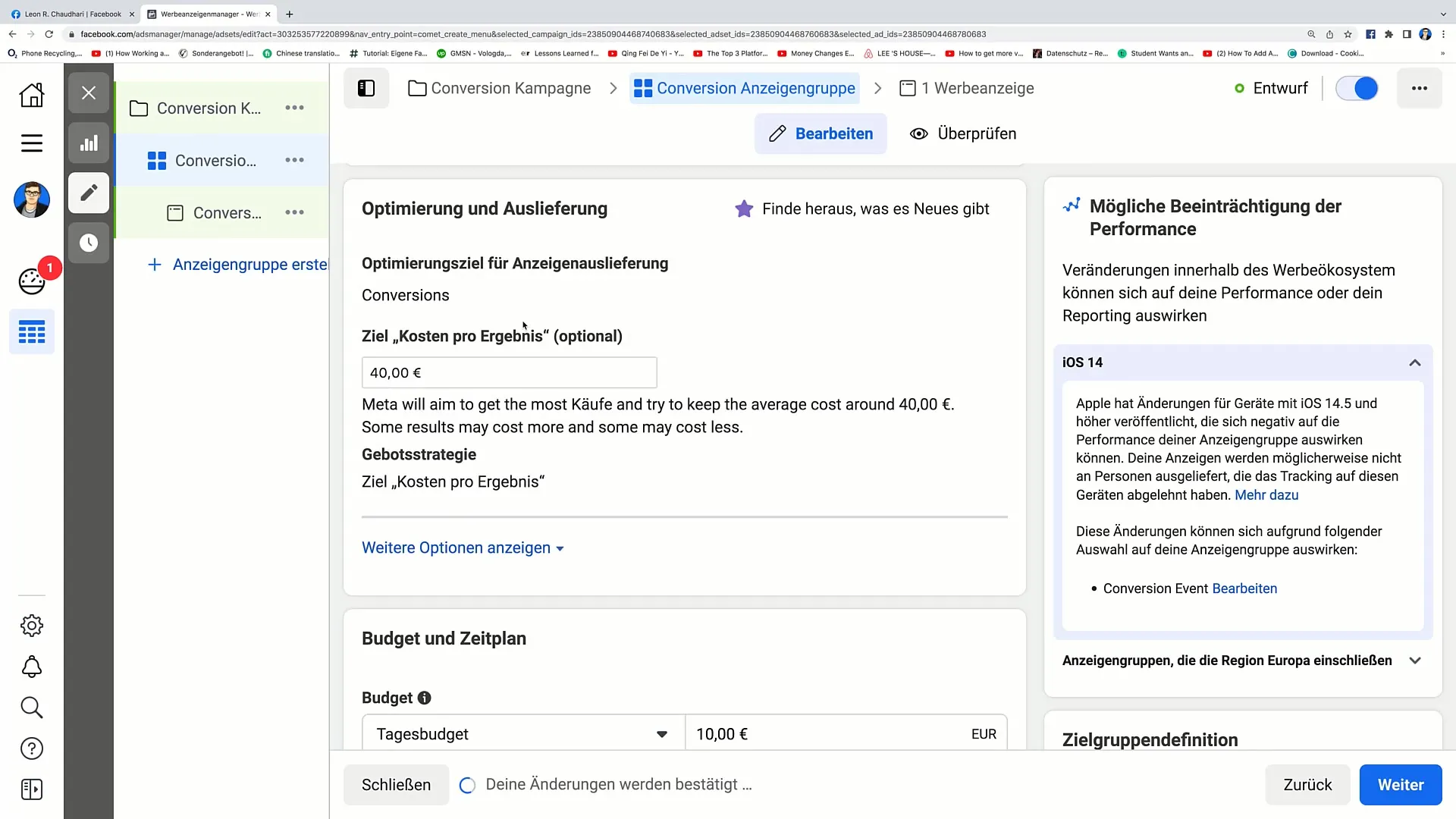 Nyní můžeš stanovit svůj rozpočet a časový plán pro zobrazení reklam. Zde se ptáš, kolik jsi ochoten(a) denně utratit za reklamu.