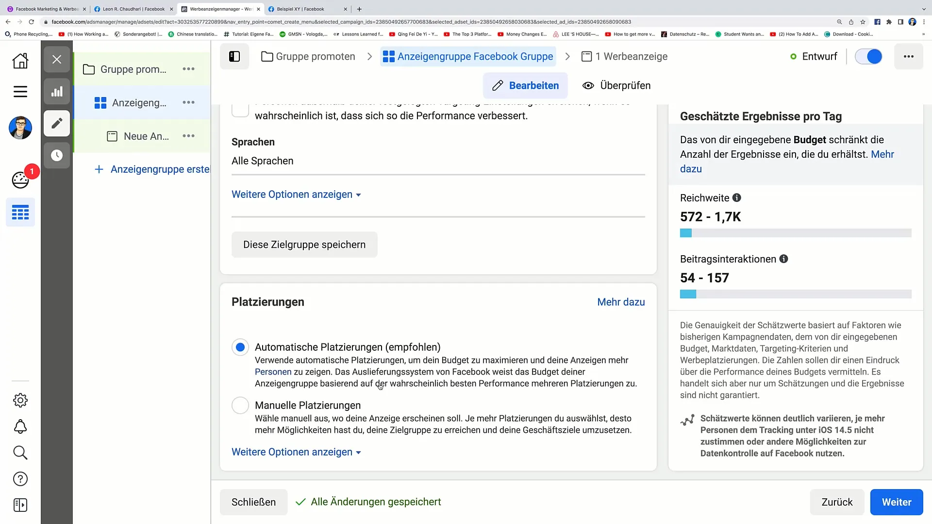 Nyní přichází rozhodující část: definice vaší cílové skupiny. Buďte zde co nejkonkrétnější. Můžete filtrovat podle umístění, věkových skupin a zájmů. Například: Možná umístění jsou Německo, Rakousko a Švýcarsko; věkovou skupinu své cílové skupiny byste mohli nastavit na 25 až 30 let.