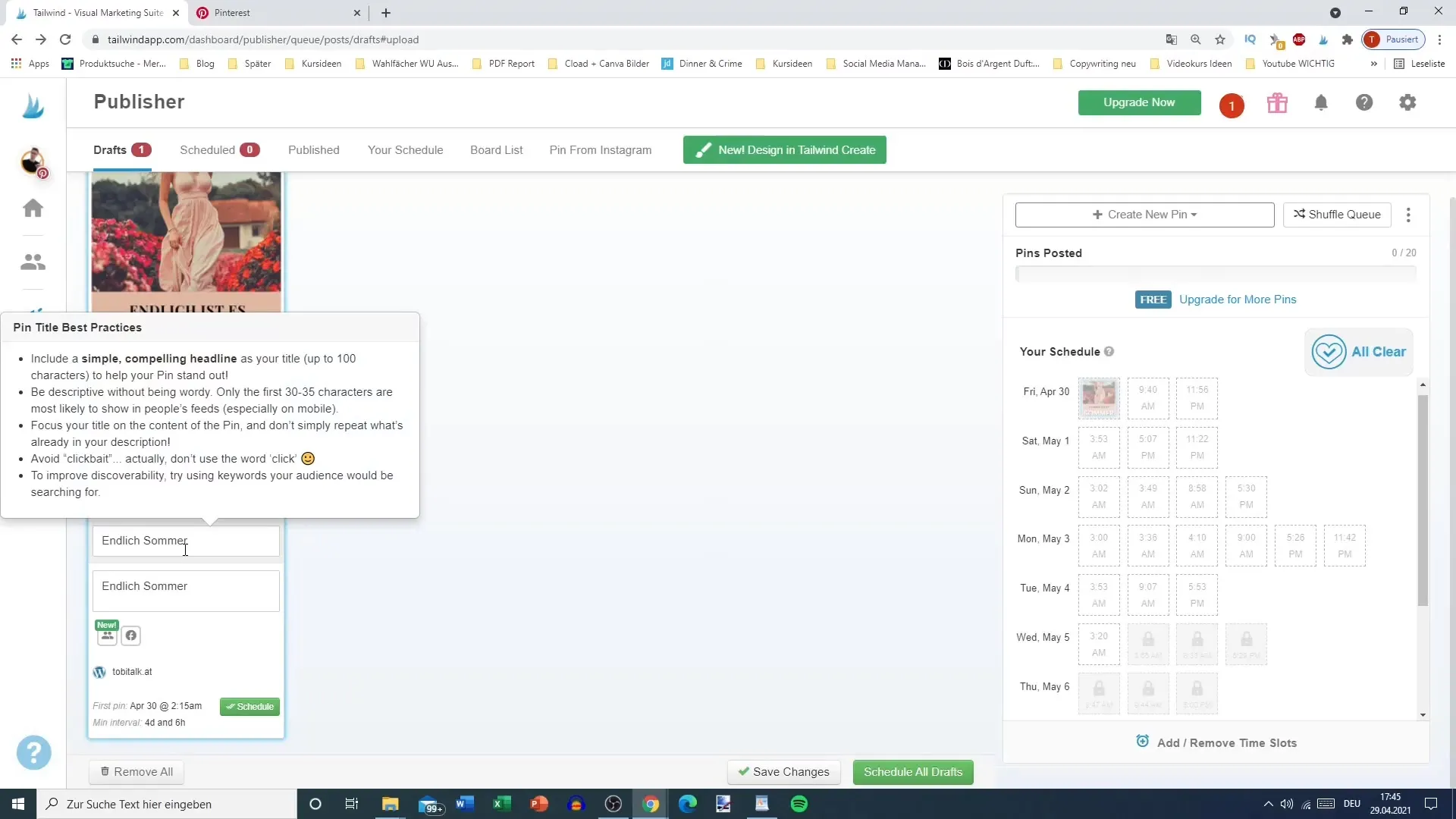 Po naplánování příspěvku můžete pokračovat s dalším. Máte možnost nahrát další obrázky nebo repinout existující obsah. Dbejte na to, abyste dodržovali intervaly mezi jednotlivými piny, abyste nebyli Pinterestem považováni za spam.