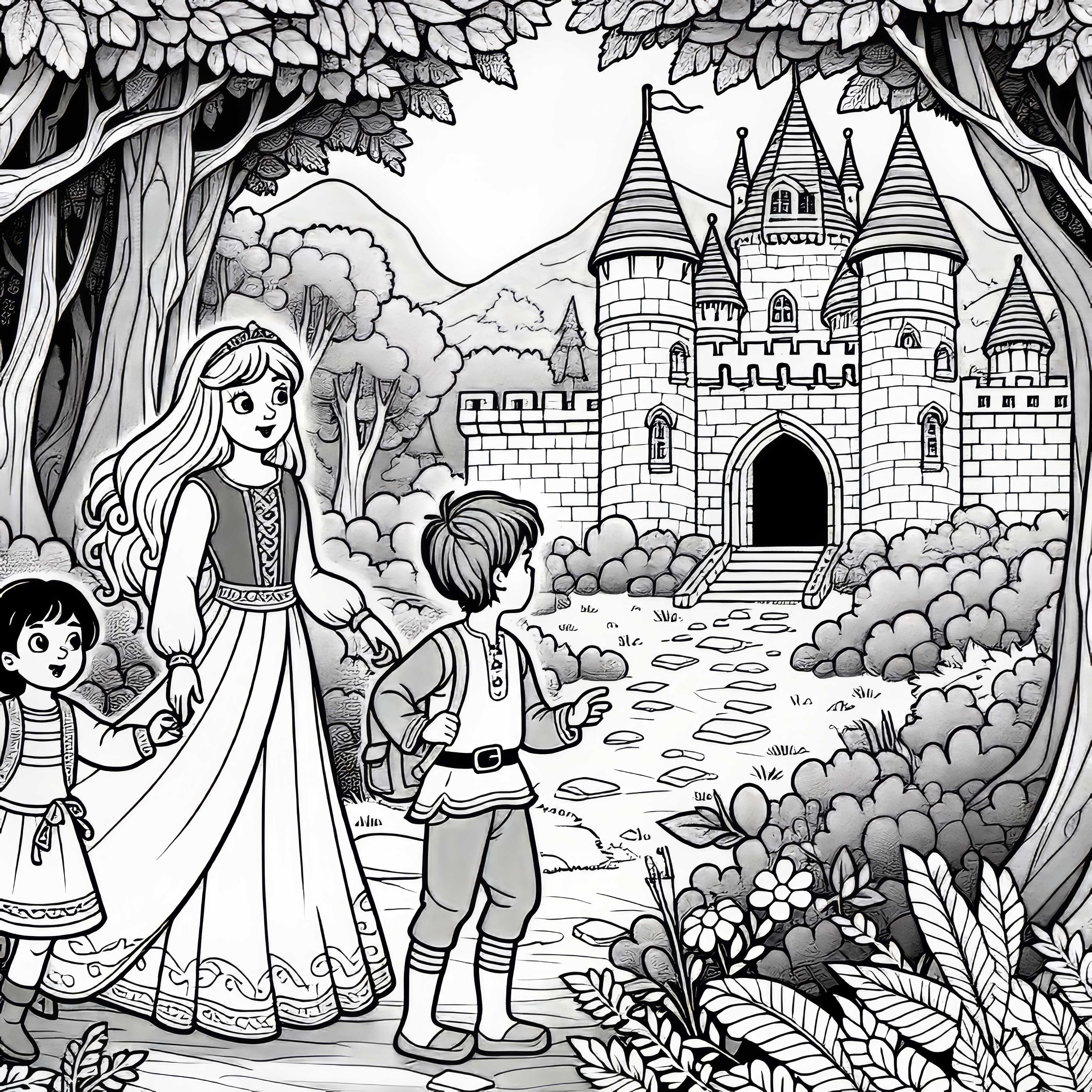 To børn står foran det hemmelighedsfulde eventyrslot i skoven - Malebillede gratis