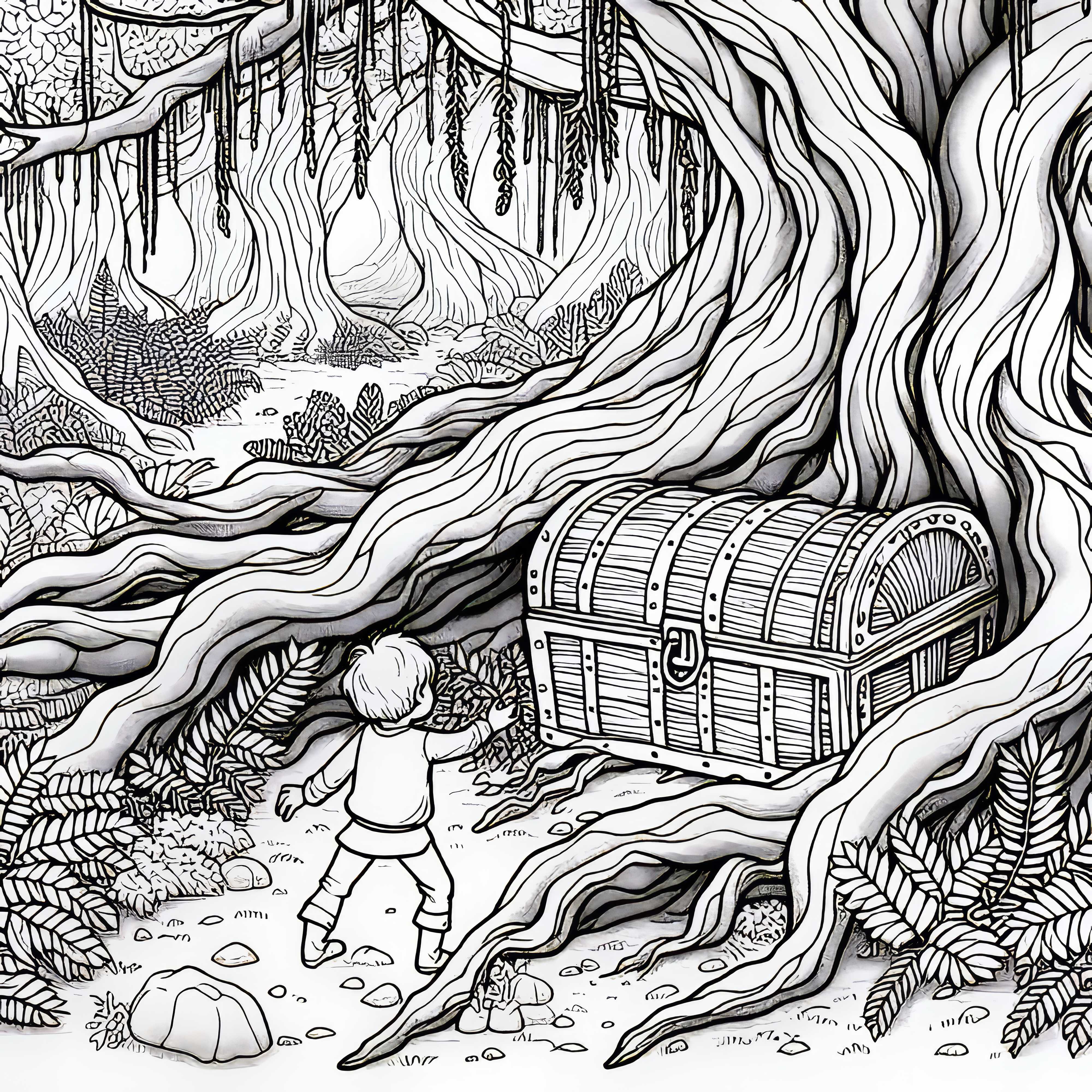 Barn klatrer op ad en kæmpe mosdækket træ i den fortryllede eventyrskov – gratis malebillede