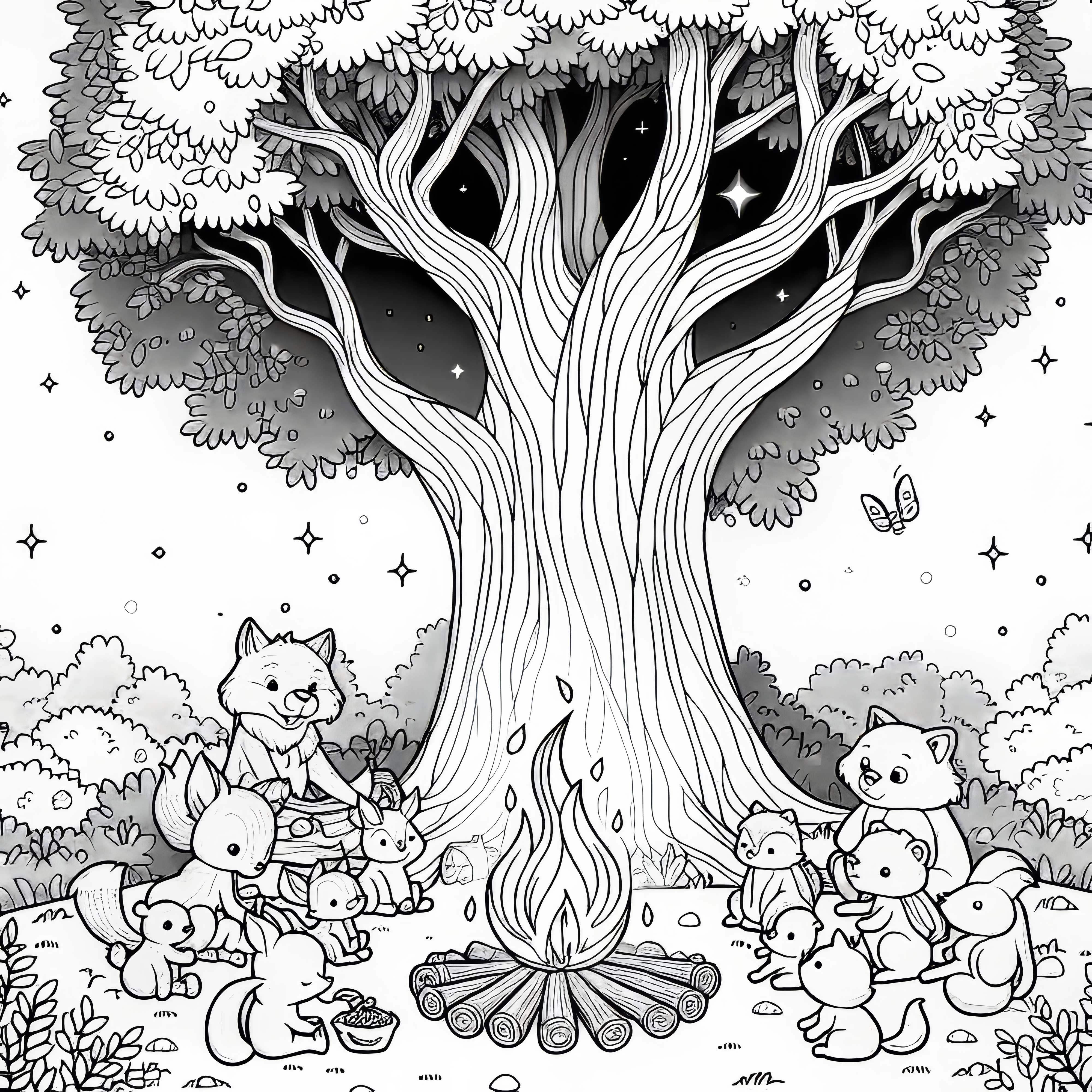 I den fortryllede eventyrskov samles dyr omkring lejrbålet under træet – farvelægningsskabelon gratis