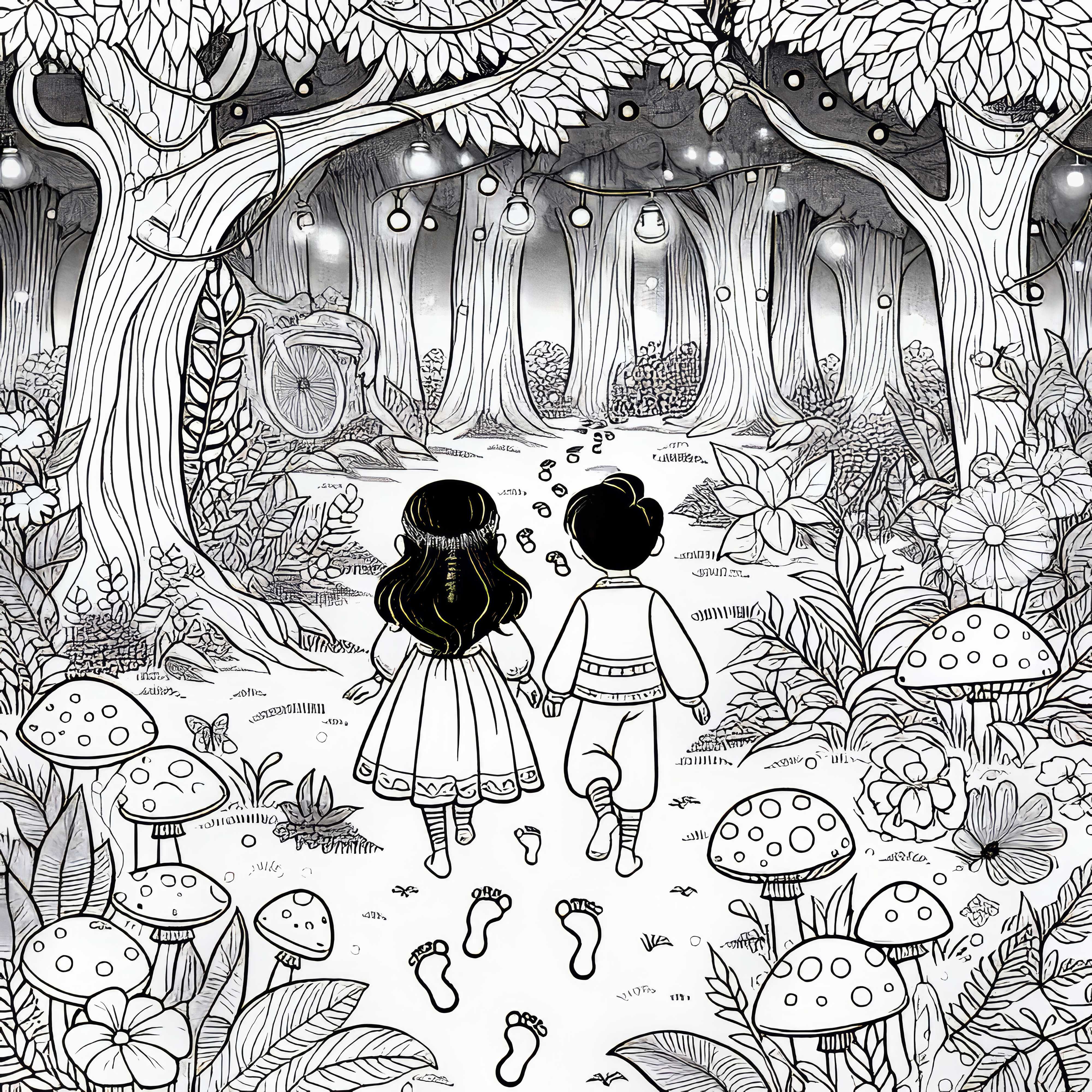 I en fortryllet eventyrskov fører en sti gennem lysende svampe og træer - gratis farvelægningsbillede