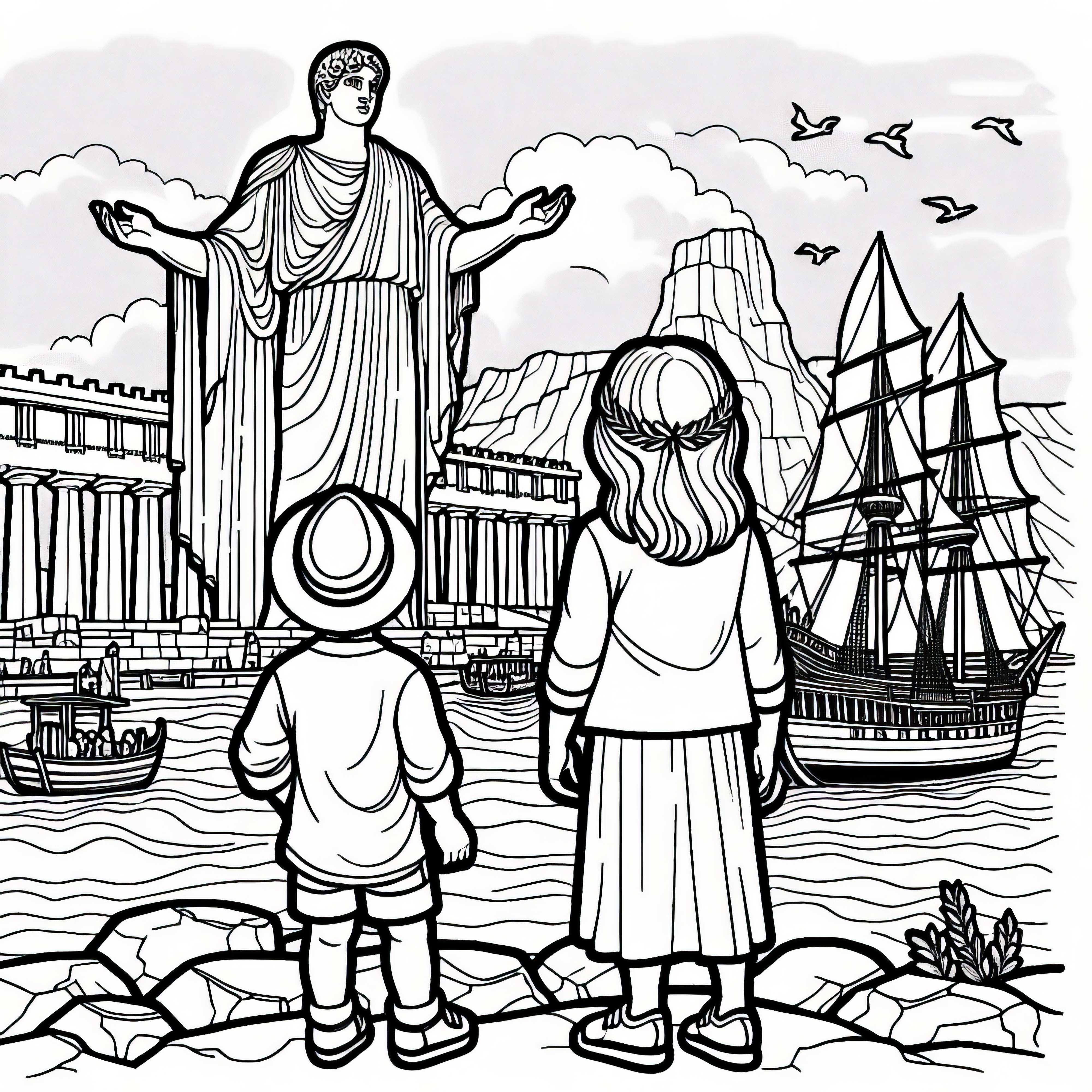 Koloss af Rhodos farvelægningsskabelon til verdensvidundere til download