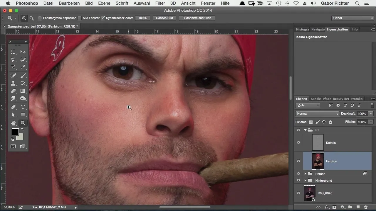 Når du har fjernet de største forstyrrelser, kan du tænde og slukke for hele billedet. På den måde kan du bedre se indflydelsen af din retouchering på helhedsindtrykket. Ofte vil der også dukke uønskede detaljer som hår eller linjer op, som du også ønsker at behandle.