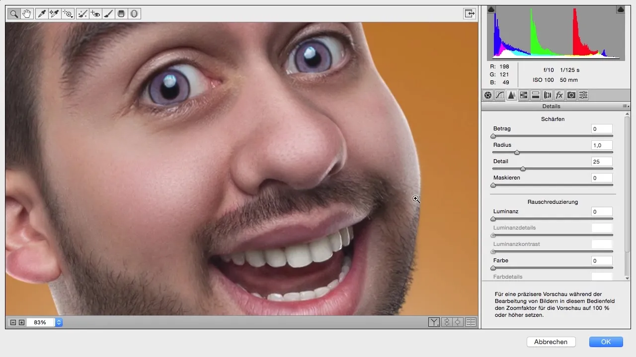 Et vigtigt skridt er støjreduktionen, som du ser i fanen „Detaljer“. For at glatte huden, træk lysstyrkeregleren til højre, så du får en glat hudoverflade. Vær forsigtig med intensiteten; en ekstrem indstilling kan få hudens karakter til at virke unaturlig.